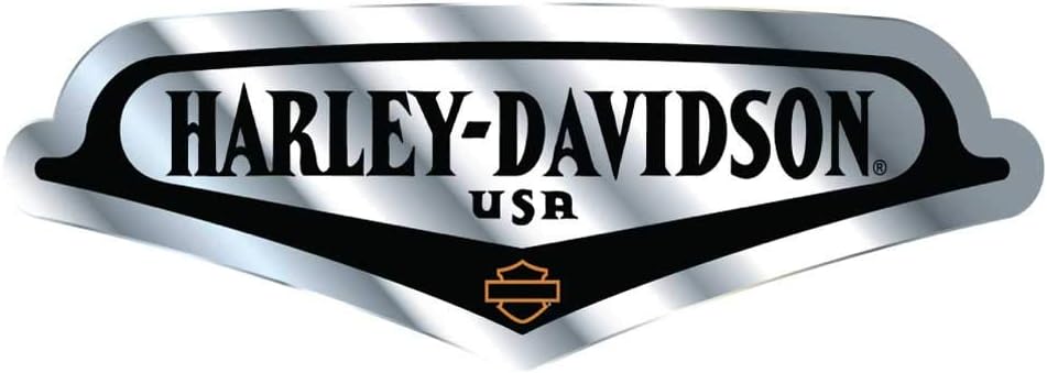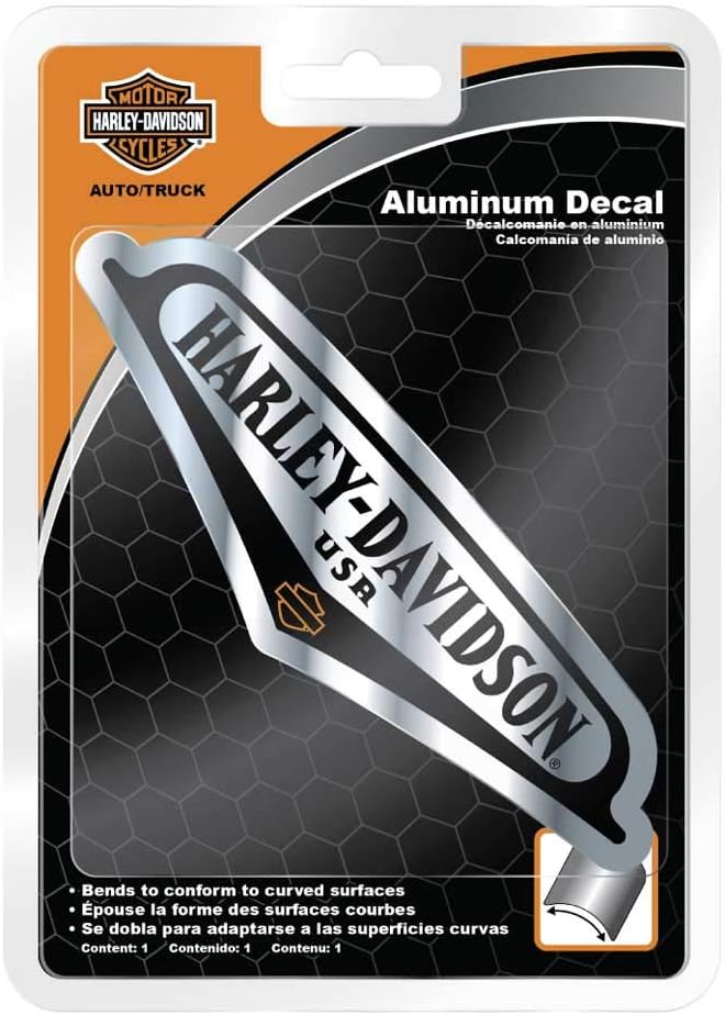 Harley-Davidson Aluminum Decal, CG41718. Made from high-quality aluminum material. This decal bends to conform to curved surfaces. Sheet Size: 5" x 7". Decal Size: 6" x 2". This sticker will adhere to any smooth, flat surface.