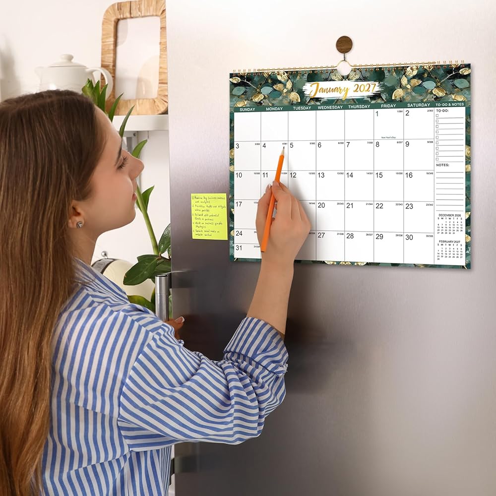 تقويم عالي الجودة 2026-2027 - ورق أكثر سمكًا من أكثر التقويمات 26-27 الموجودة في السوق لتقليل النزيف ومحو الاهتراء ومشاكل الظل. ورق أبيض ساطع لخلق مساحة كتابة نظيفة وحماية البيئة، ويتم طباعة تقويم الحائط هذا 2026-2027 لمدة 18 شهرًا باستخدام حبر ملون عالي الجودة ومتوازن جيدًا.