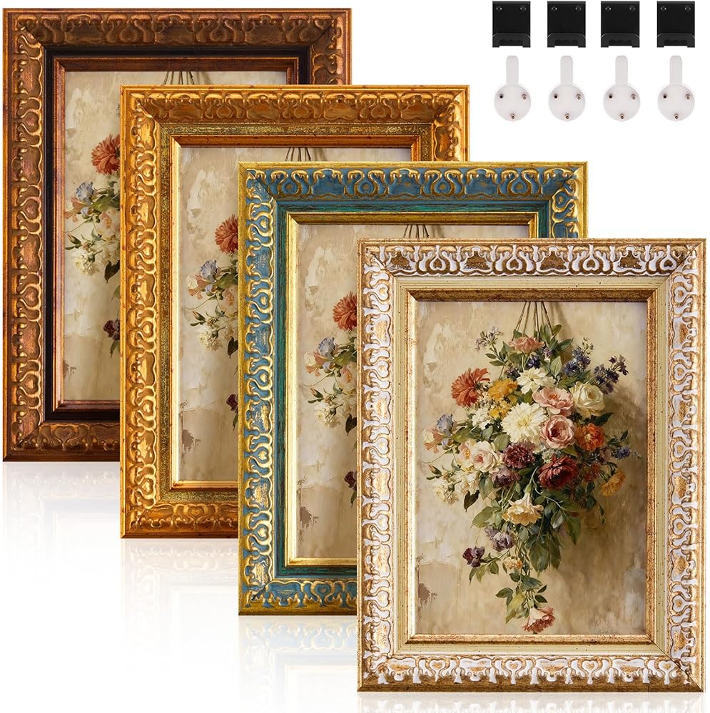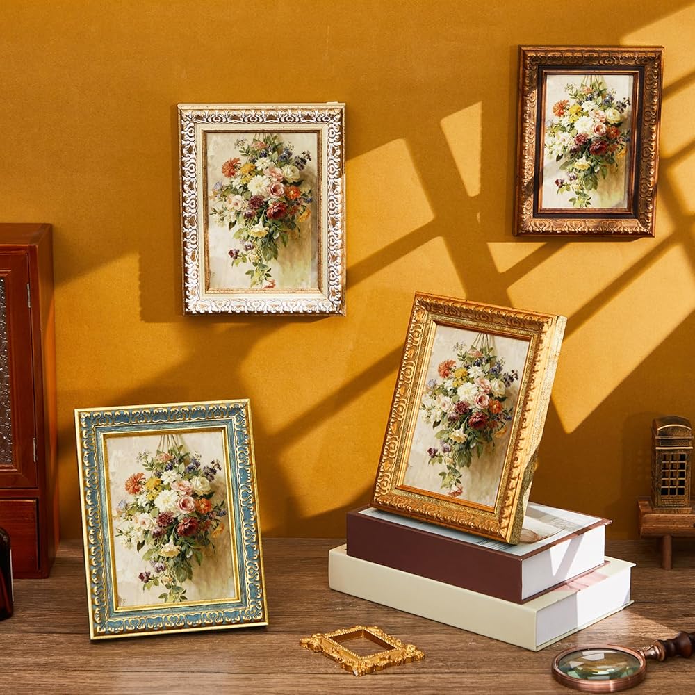 Create an instant gallery with this set of four vintage frames for wall display. The assortment of ornate picture frames about 5 x 7 inches size is designed for coordinated styling. This curated collection simplifies the process of designing a unified wall arrangement. It provides a complete solution for showcasing multiple photos together.