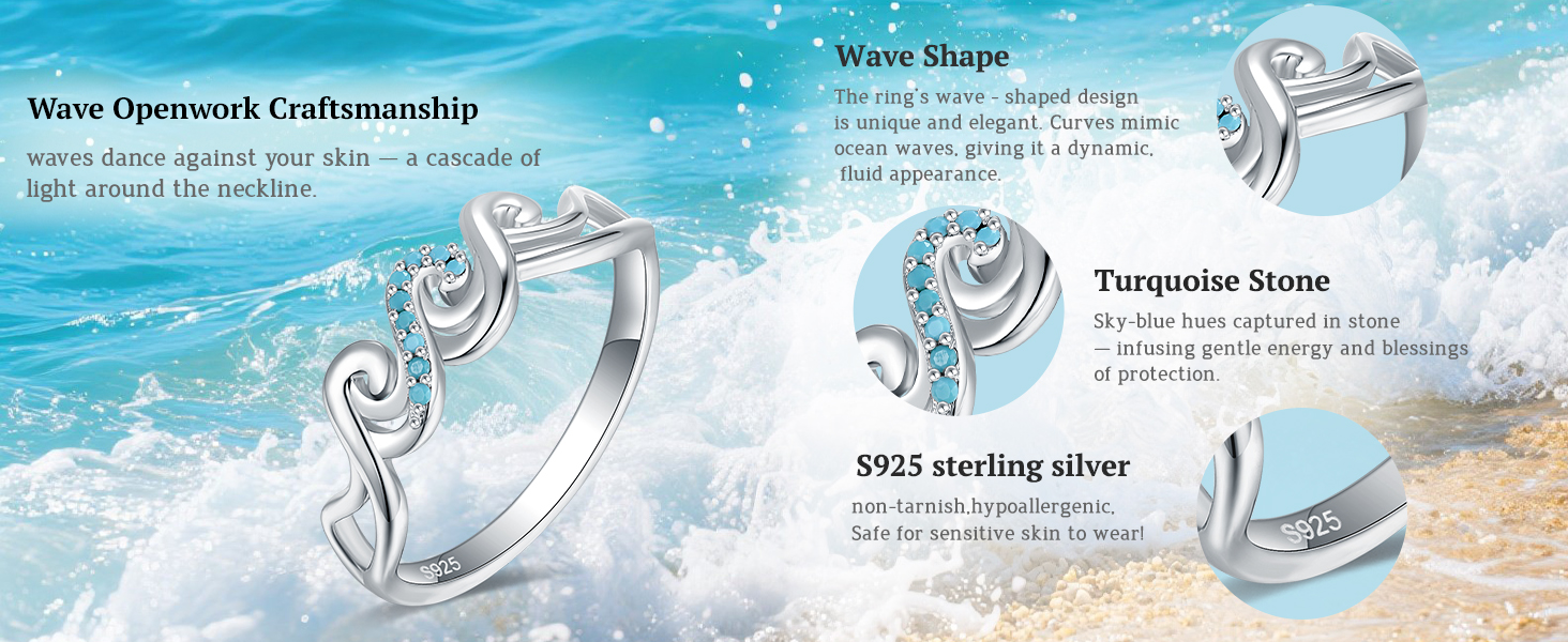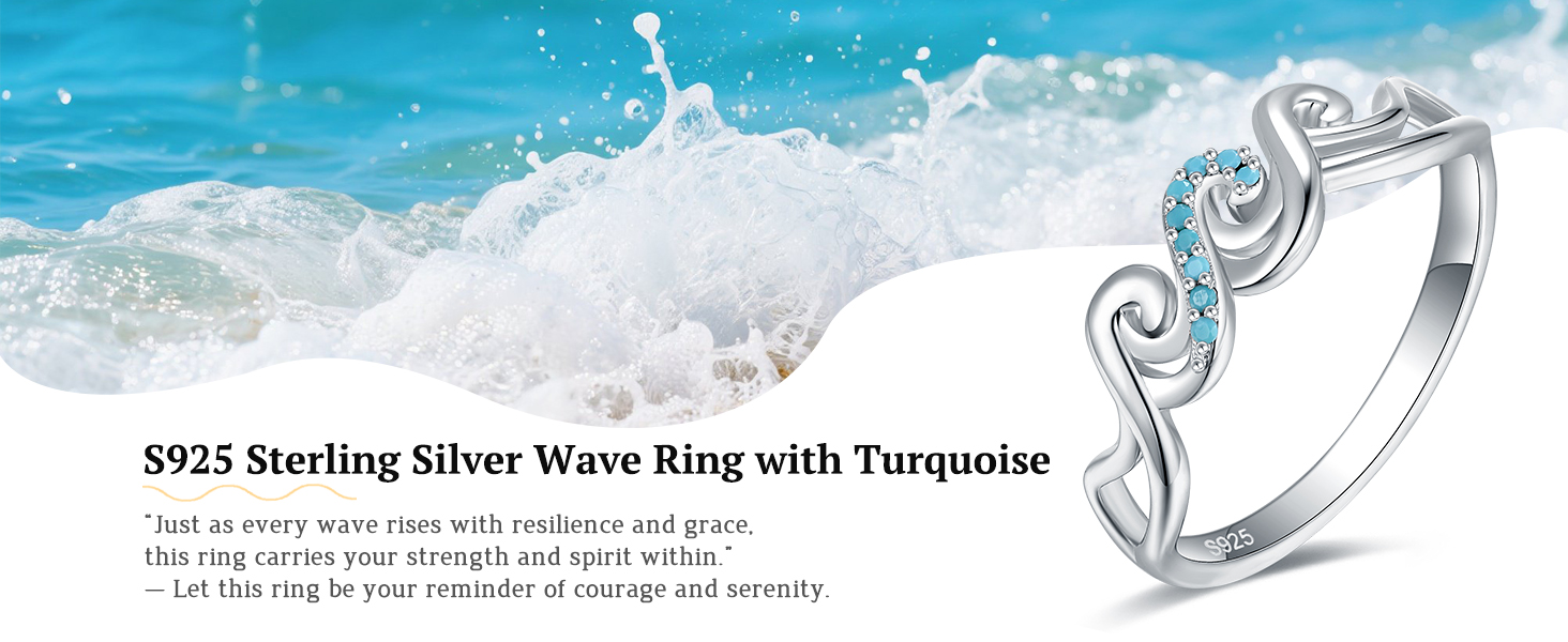 Like the gentle ocean waves, strength and grace flow quietly within this 925 sterling silver wave ring. Crafted from hypoallergenic solid silver, it's accented with genuine turquoise—a stone cherished for its calm and protective energy in silver jewelry.