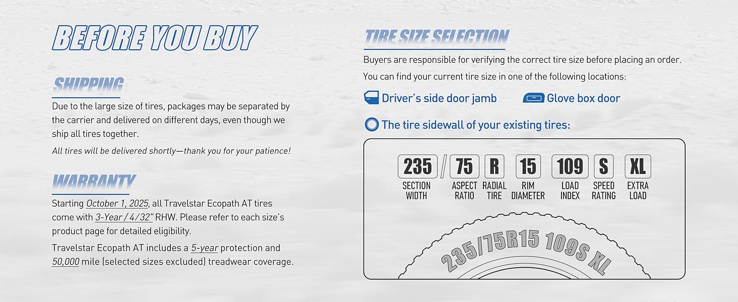 مزايا الضمان: مدعومة بضمان لمدة 5 سنوات وضمان مخاطر الطريق لمدة 3 سنوات - تنطبق التغطية على حالات فشل محددة مثل الانتفاخات أو تسرب الهواء أو الانفجارات التي تحدث خلال 3 سنوات من الشراء وخلال أول 4/32 بوصة من تآكل المداس.