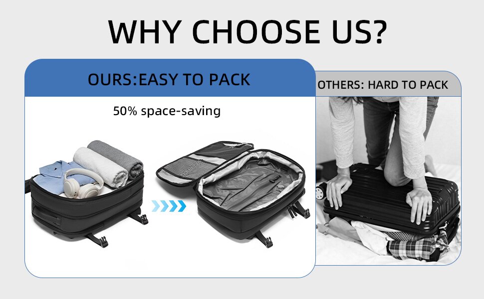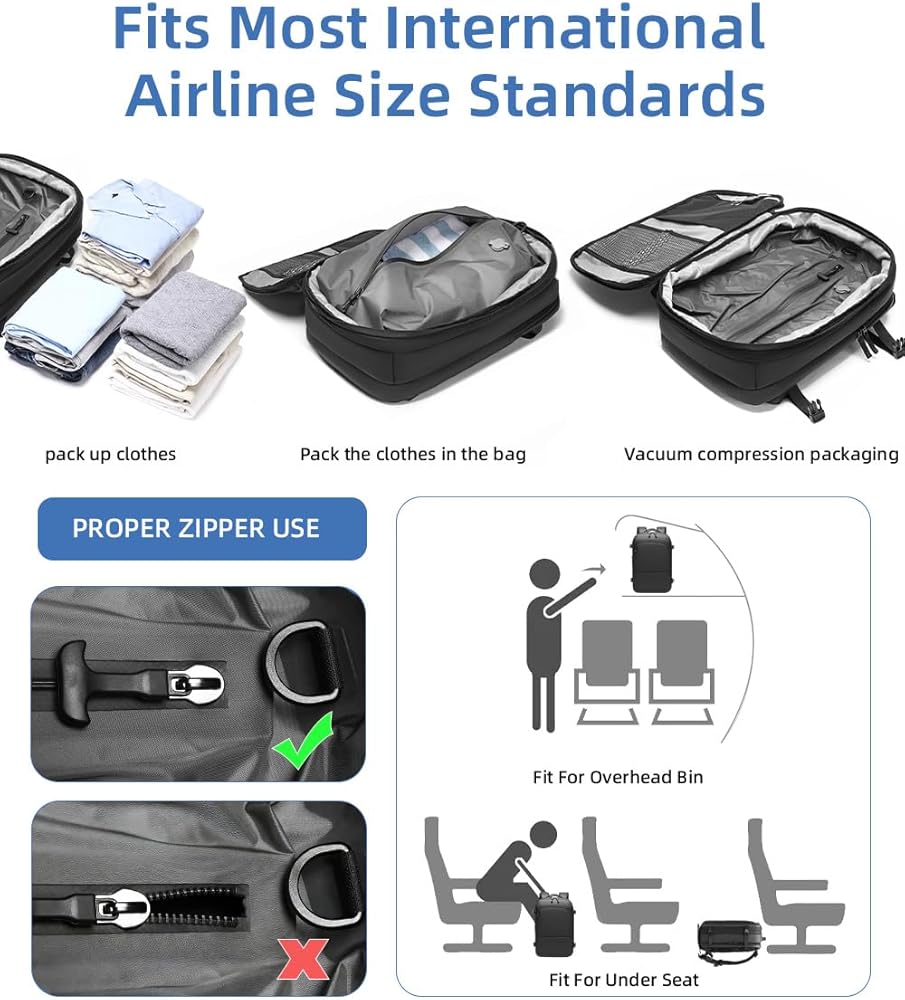 متوافق مع الحمل: مصمم لتلبية متطلبات الحجم التي يمكن حملها بواسطة شركات الطيران، مما يسمح لك بالمرور عبر المطارات دون رسوم فحص الأمتعة مع زيادة كفاءة التعبئة الخاصة بك