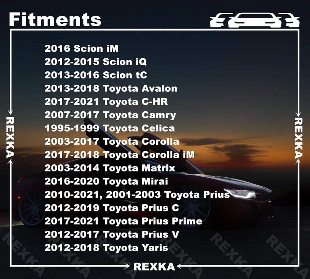 - Fits: Scion: iM, iQ, xB Toyota: Avalon, Camry, Corolla, Corolla iM, Matrix, Mirai, Prius, Prius C, Prius Plug-In, Prius Prime, Prius V, Sienna, Yaris