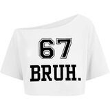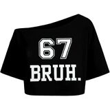 تي شيرت Six Seven Slang: مصمم بياقة عصرية مكشوفة الكتفين وأكمام قصيرة ورسم "67 Bruh" الجريء، هذا التي شيرت المستوحى من الميم يضفي الفكاهة والشخصية على مظهرك اليومي الكاجوال.