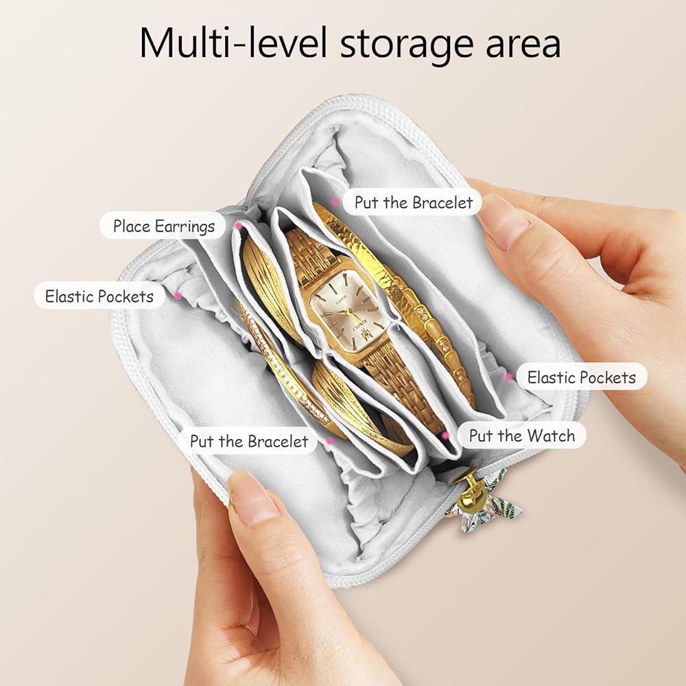 • Multi-Compartment design: This travel jewelry box Inner 6 individual pouches for necklaces, earrings, and bracelets. Featuring a velvet finish and a smooth, high-quality zipper with tassels, this mini travel jewelry bag is lined with soft cotton to effectively protect your jewelry from friction and damage