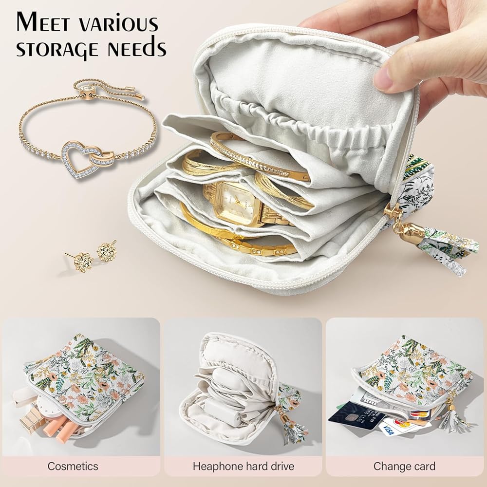 Travel-Ready Portable Organizer: This travel jewelry organizer is your perfect trip companion. At 5.5×5.5×1.1 inches, it's compact yet roomy enough for travel or daily use Multi-Purpose Utility: Beyond jewelry, this versatile pouch organizes coins, makeup, and small essentials. It adapts to business trips, vacations, or short outings, providing a reliable storage solution for diverse travel needs Multi-Compartment design: This travel jewelry box Inner 6 individual pouches for necklaces, earrings, and bracelets. Featuring a velvet finish and a smooth, high-quality zipper with tassels, this mini travel jewelry bag is lined with soft cotton to effectively protect your jewelry from friction and damage Compact and Portable: Lightweight travel case design fits easily into luggage, purses, or carry-on bags for convenient jewelry organization on the go Ideal Gift Option: Perfect for storing necklaces, earrings, rings, bracelets, and more, this jewelry holder organizer makes a thoughtful gift for friends, family, and loved ones on any occasion