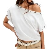 تصميم متعدد الاستخدامات: ارفع أناقتك مع تفاصيل الثقوب المعدنية التي تزين خط العنق والأصفاد، مما يوفر مظهرًا جريئًا ومثيرًا. يتميز هذا الجزء العلوي بتصميم أنيق مكشوف الكتفين ويمكن أيضًا ارتداؤه بكتف واحد لإضفاء لمسة من الجاذبية. لقد تم تصميمه ببراعة ليقدم لمحة من الإغراء الذي يكشف عن الكتفين مع توفير تغطية مريحة، ويوازن بشكل مثالي بين الرقي والأجواء المثيرة.