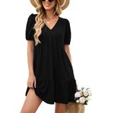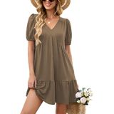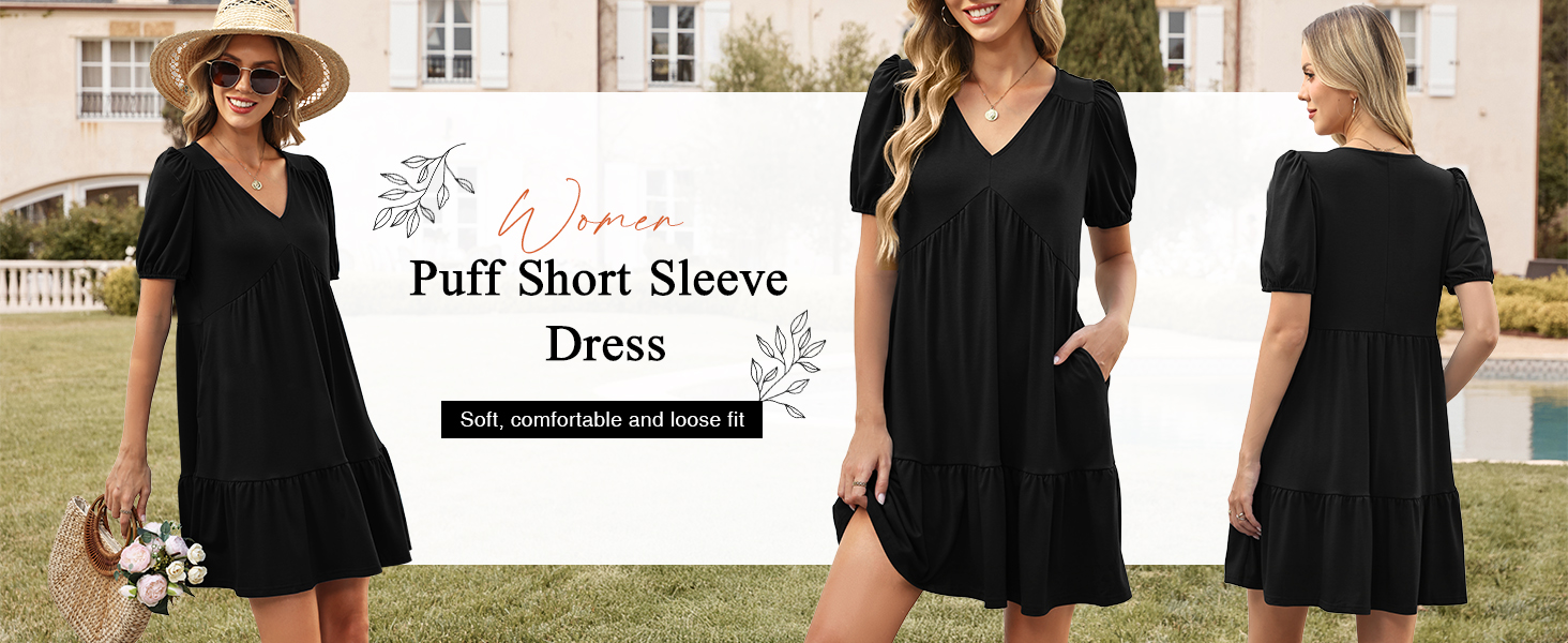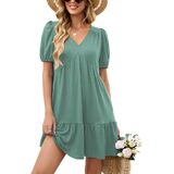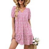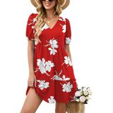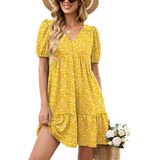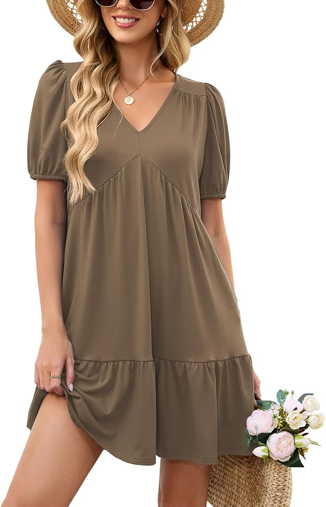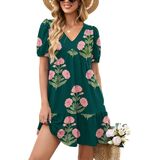 المزايا: فساتين صيفية للنساء تأتي بأكمام قصيرة منتفخة، رقبة على شكل حرف V، لون موحد وطباعة زهور جميلة، خصر إمبراطوري، خط، كشكشة متأرجحة، طول الركبة الصغير وجيبين جانبيين، فستان كاجوال للنساء يناسب أي شكل جسم.