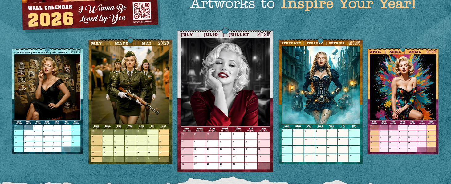 تقويم حائط مارلين مونرو السنوي لعام 2026. تقويم معلق على الحائط من ورق الحرير لعام 2026 مع 12 عملًا فنيًا مذهلاً.