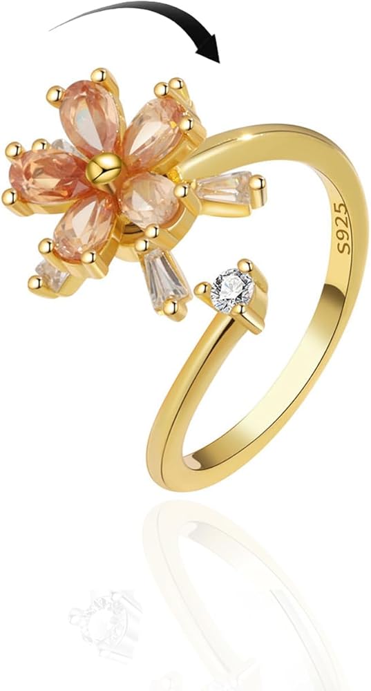 A cute flower spinner anxiety ring with an adjustable open band. Gently spin the floral charm to relax your mind while enjoying a bright, gold-plated finish.