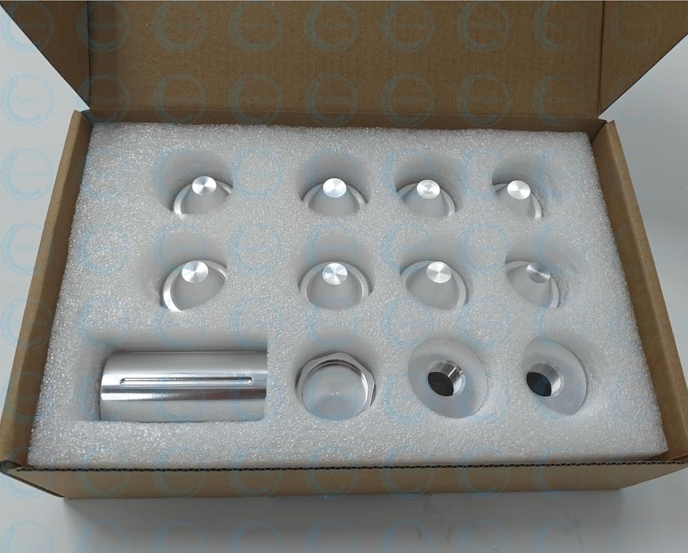 These come with 8 protectors, cleaning chamber, end cap for chamber (to hold in cleaning solution), and a 5/8-24 hose inlet for cleaning the caps when needed.