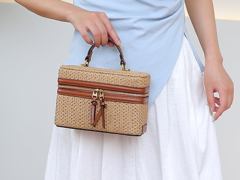 【الحزام】: حقيبة كروس لطيفة من القش مع مقبض علوي من الجلد النباتي. يمكن استخدامها كحقيبة كروس للنساء وحقائب يد.