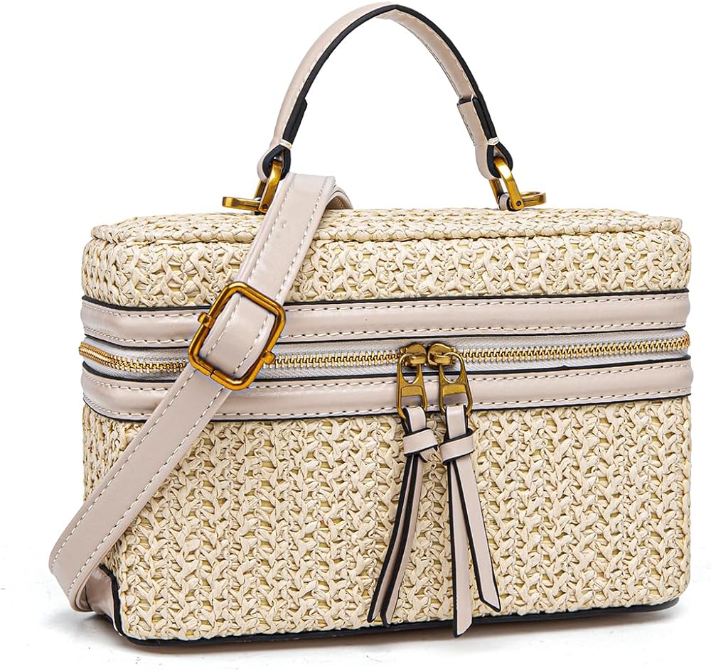 【الخامة: هذه الحقائب ذات التصميم الجديد مصنوعة من القش الطبيعي والجلد النباتي، وسحاب معدني متين وطلاق.