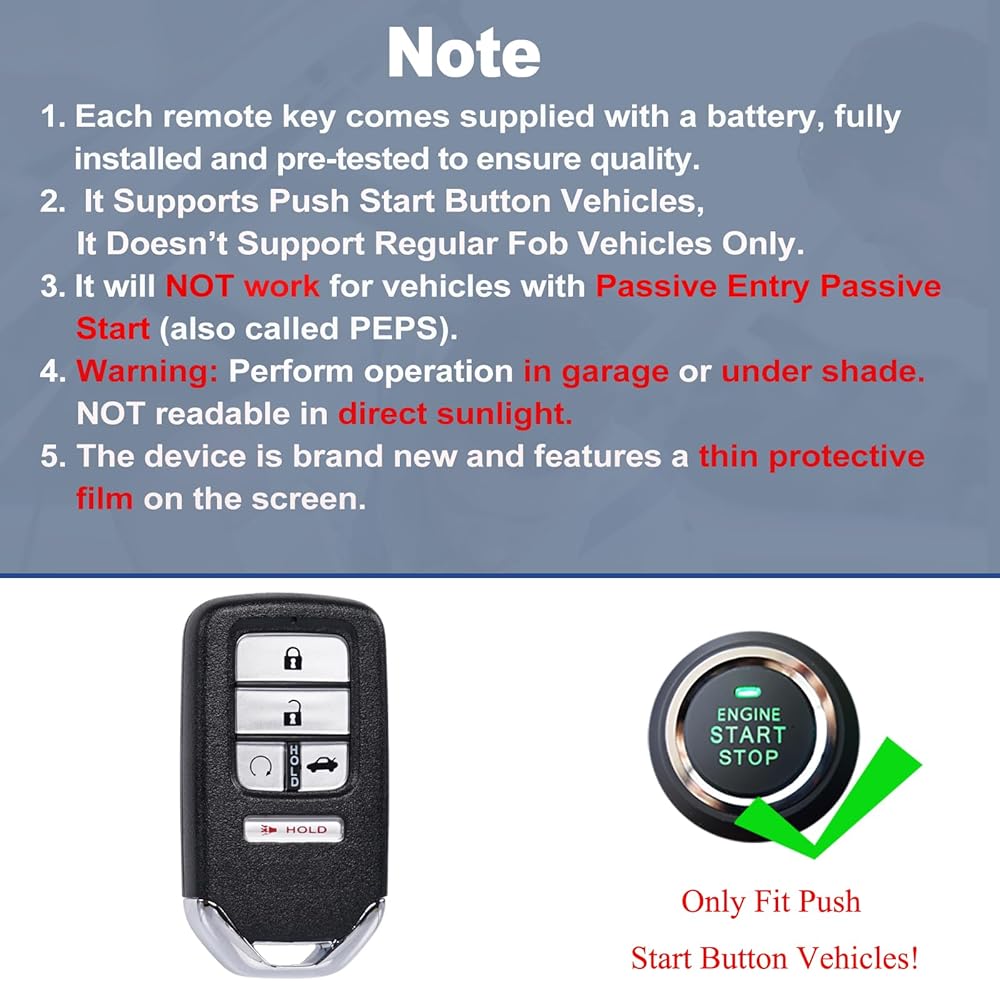 الإعداد: يناسب سيارات مختارة من هوندا وأكورا. وهو متوافق مع مفتاح التحكم عن بعد هوندا سيفيك 2016 2017 2018 2019 2020 2021. يدعم جهاز الإرسال هذا فقط مركبات زر التشغيل، ولا يدعم المركبات الرئيسية العادية. يرجى التحقق من شريط "Amazon Confirmed Fit" الموجود أعلى هذه الصفحة قبل الشراء للتأكد من أن هذا المنتج متوافق مع سيارتك