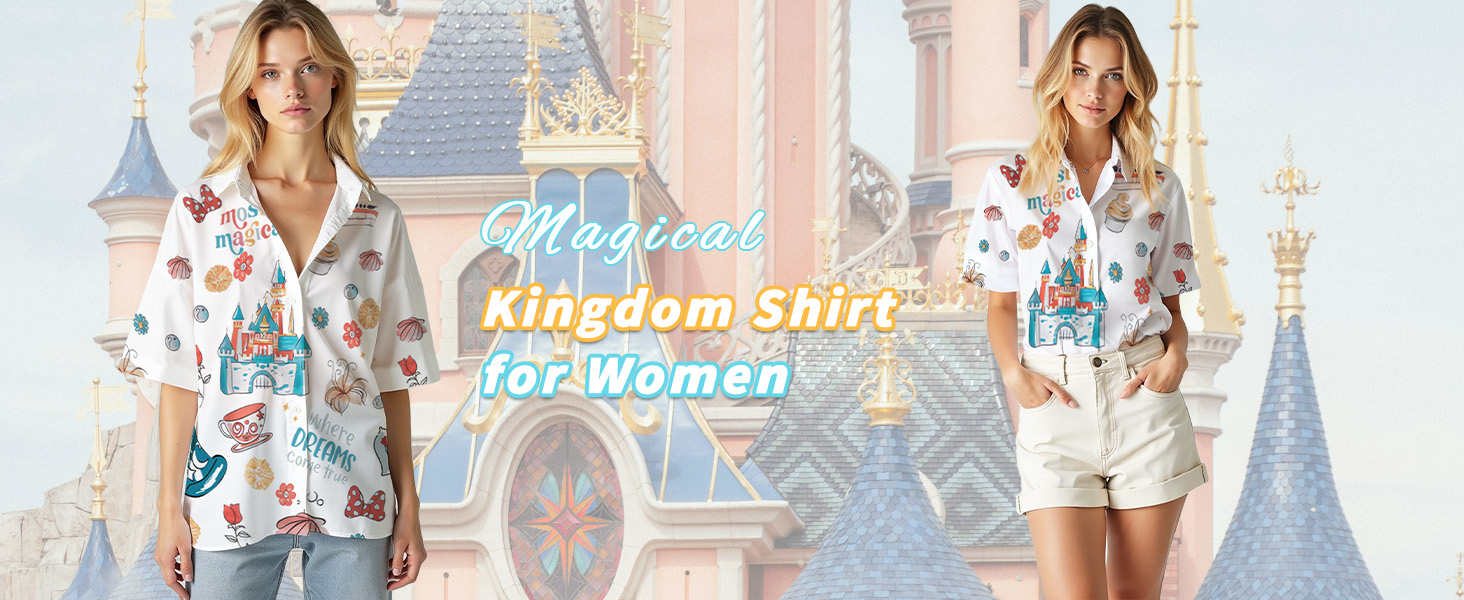 المواد: قميص سحري للنساء مصنوع من بوليستر عالي الجودة، ناعم، خفيف الوزن، مسامي، مريح، صديق للبشرة عند الارتداء. مع قمصاننا العلوية ذات الأزرار ذات طباعة القلعة، والتي تتميز بتصميم جرافيكي لطيف ينضح بالرومانسية والسحر.