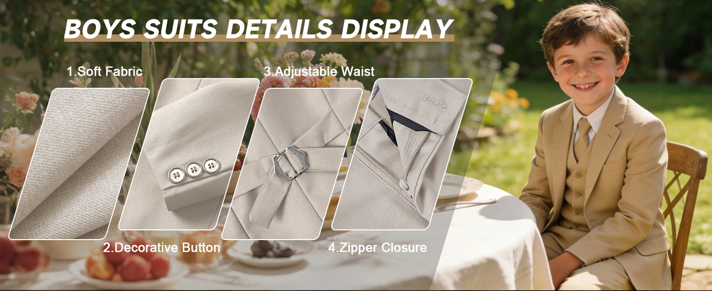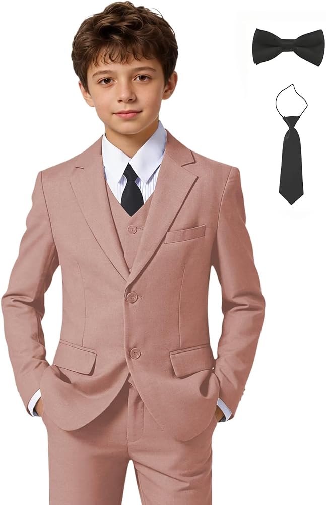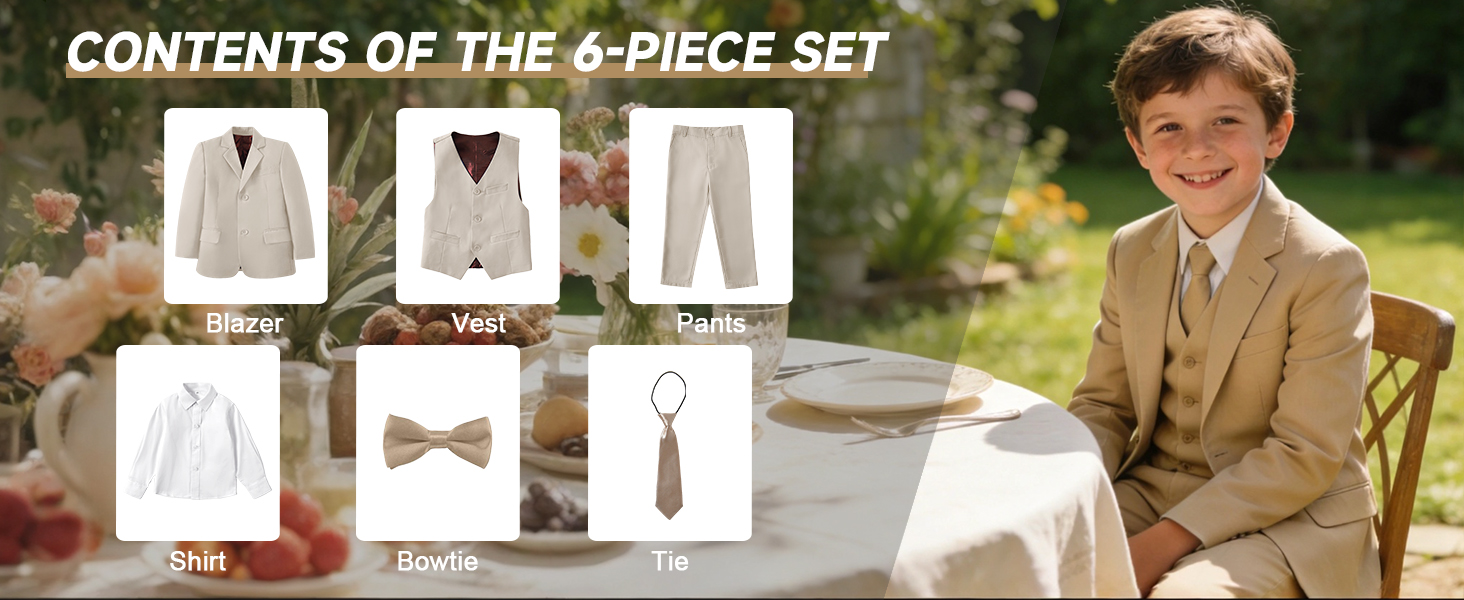 • مجموعة بدلة رسمية كاملة للأولاد مكونة من 6 قطع: تتضمن مجموعة بدلة السهرة الرسمية هذه سترة ذات طية صدر مشقوقة وسترة وقميص أبيض وبنطلون بخصر قابل للتعديل، بالإضافة إلى اثنين من الملحقات المتطابقة (ربطة عنق وربطة عنق).