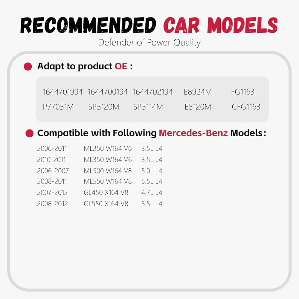 • 【نماذج المركبات المتوافقة】متوافقة مع ML350 W164 V6 3.5L 2006-2011، ML350 W164 V6 5.5L 2010-2011، ML500 W164 V8 5.0L 2006-2007، ML550 W164 V8 5.5L 2008-2011، GL450 X164 V8 4.7L 2007-2012، GL550 X164 V8 5.5L 2008-2012