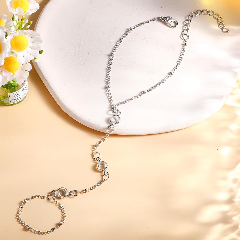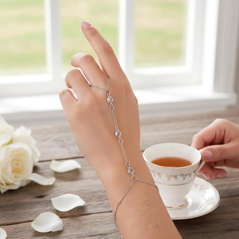 Elevate your accessory game with our dainty silver hand chain bracelet, designed to create a seamless connection between your fingers and wrist. This trendy piece features adjustable chains that ensure perfect fit for various hand sizes, while the sparkling zircon stones add a touch of luxury to your everyday style. The unified design between ring and bracelet creates a distinctive fashion statement that complements both casual and formal outfits.