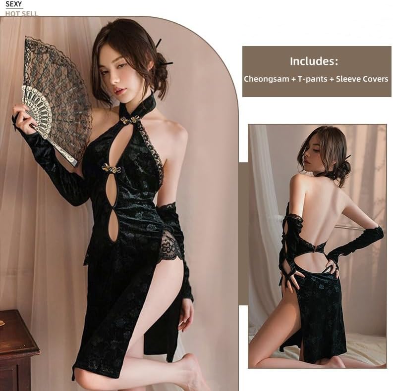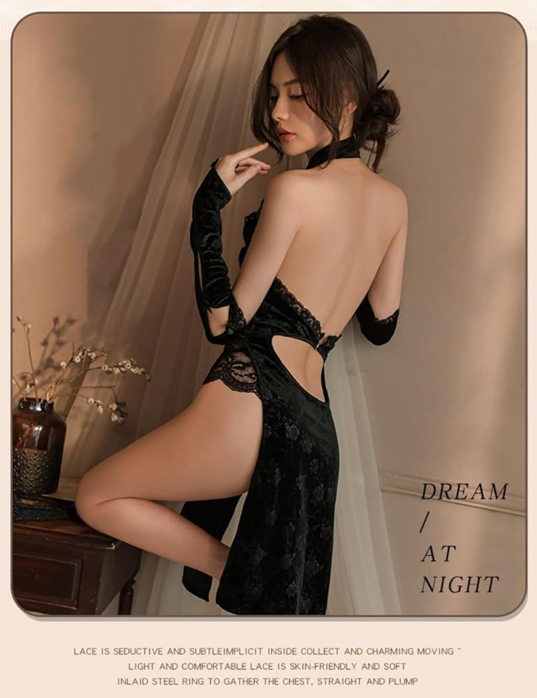 【Unique Design】 This lingerie for women roleplay offers a modern interpretation of the traditional Chinese Qipao design. The luxurious black velvet fabric features an elegant high-split silhouette with intricate lace detailing and decorative cutouts.The halter neckline with mandarin collar adds a classic touch, while the backless design creates an alluring silhouette. This sophisticated piece combines traditional aesthetics with contemporary styling.