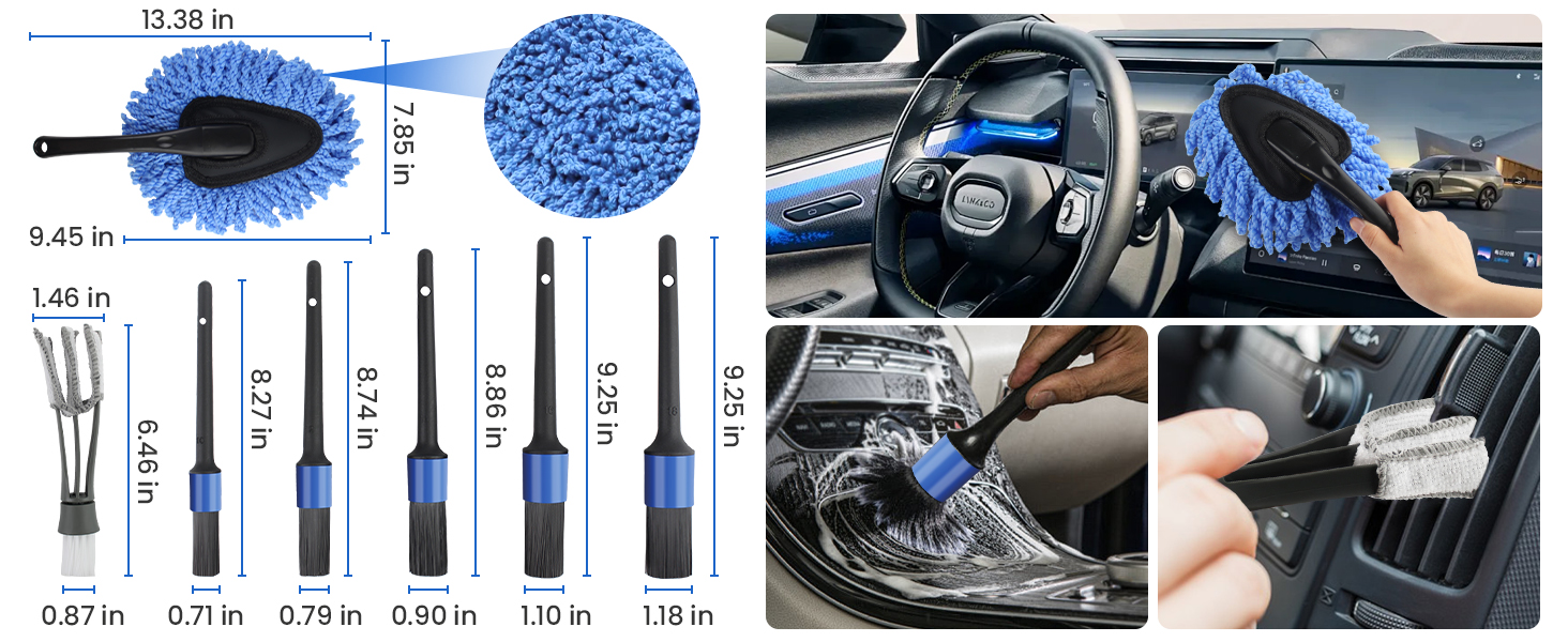 • طقم تنظيف السيارة الداخلي: تعمل منفضة الغبار المصنوعة من الألياف الدقيقة متعددة الأغراض على إزالة الغبار من داخل سيارتك دون عناء وتعمل بشكل جيد على قدم المساواة للاستخدام المنزلي. 5 فرش لتفصيل السيارة بأحجام مختلفة تتعامل مع جميع المناطق التي يصعب الوصول إليها، بما في ذلك الشقوق والزوايا وفتحات الهواء والمقاعد وصواميل العروة والمزيد. تم تصميم الفرشاة الداخلية للسيارة ذات الطرفين خصيصًا لتنظيف فتحات تهوية السيارة: يصل رأسها ثلاثي الشوكات إلى شرائح التهوية للتخلص من الغبار، بينما يقوم طرف الفرشاة بإزالة الأوساخ من الفجوات الضيقة