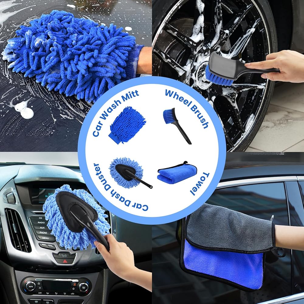• طقم غسيل السيارة الخارجي: يتميز قفاز غسيل السيارات فائق الامتصاص بسوار معصم مرن لملاءمة آمنة ومريحة. ينظف قفاز الغسيل الناعم المصنوع من الألياف الدقيقة كل محيط وحواف سيارتك دون عناء للحصول على لمسة نهائية خالية من البقع. فرشاة عجلة السيارة مجهزة بشعيرات قوية لكسر الغبار والأوساخ العنيدة، مما يضمن تنظيفًا سهلاً. توفر منشفة الألياف الدقيقة الفاخرة لدينا امتصاصًا سريعًا للماء ولمعانًا خاليًا من الخطوط. استمتع بتجربة غسيل سيارات ممتعة واحترافية مع مجموعة تنظيف السيارات الخاصة بنا