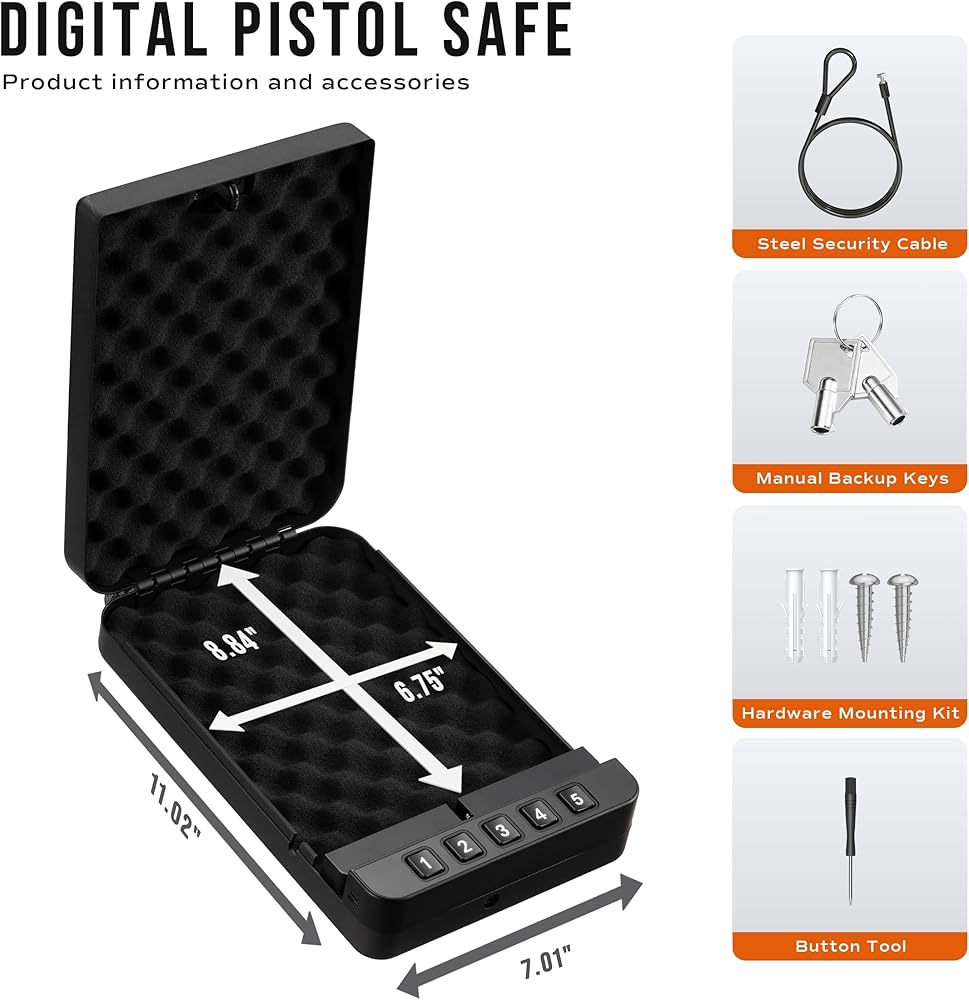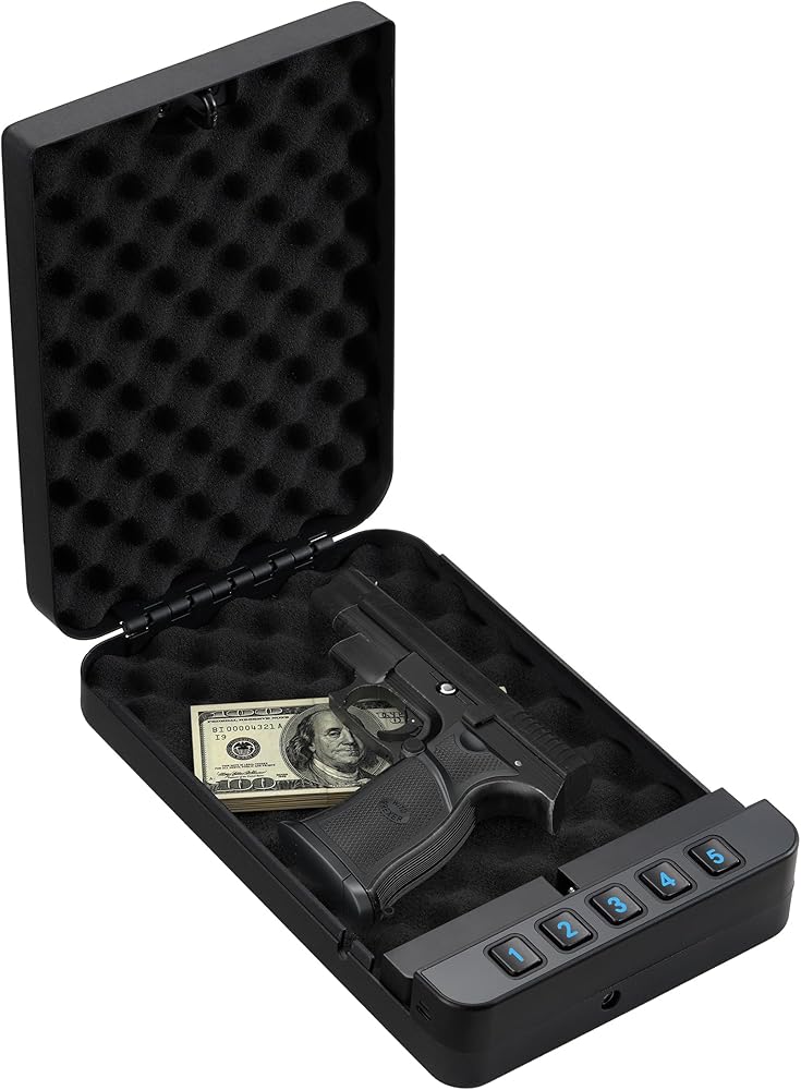 آمنة على المسدس الرقمي المحمول: بالنسبة لأي شخص يمتلك أسلحة نارية، يعد التخزين الآمن أمرًا ضروريًا، خاصة إذا كان لديك أطفال صغار يستكشفون أو أطفال زائرون آخرون قد لا يدركون الخطر المحتمل. يعد تخزين الأسلحة النارية في علبة الأسلحة هذه طريقة مسؤولة لتأمين أسلحتك النارية الصغيرة بشكل صحيح في منزلك أو مكتبك. قم بتأمين سلاحك الناري والأشياء الثمينة الخاصة بك وتمتع بالوصول السريع والمريح إليها عند الطلب