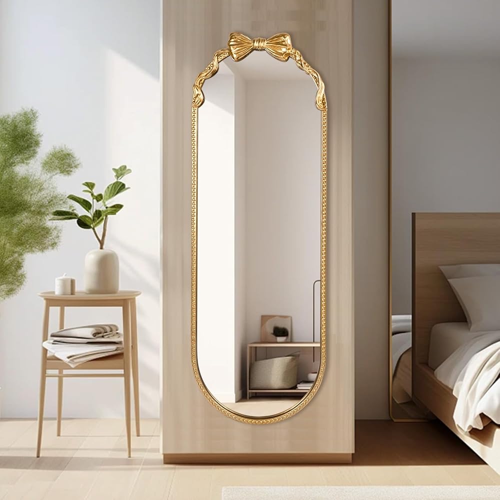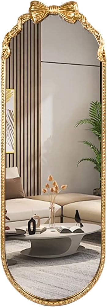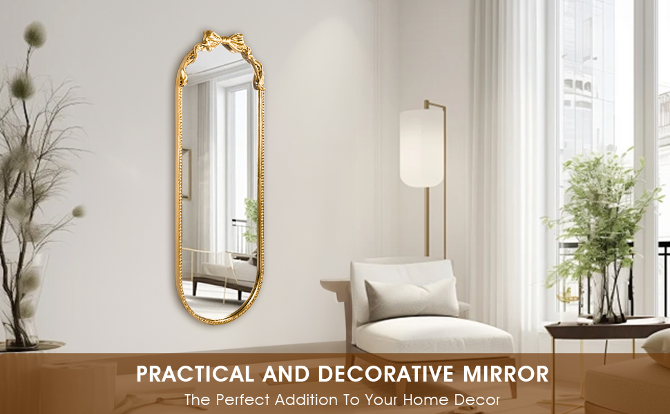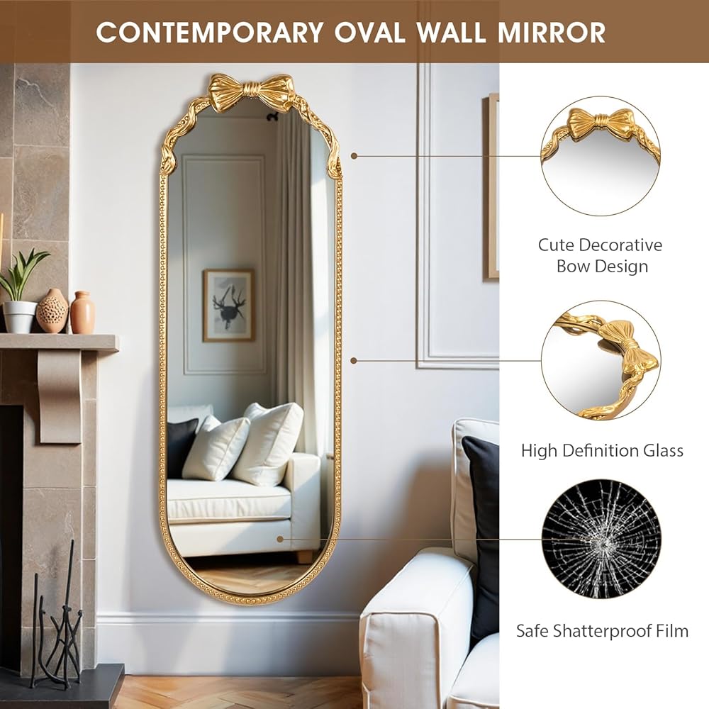 مرآة بيضاوية كاملة الطول - تتميز هذه المرآة المزخرفة المثبتة على الحائط بشكل بيضاوي كبير، وتصميم مطرز صلب مع قوس لطيف ولمسة نهائية ذهبية داكنة عتيقة للإطار، مما يكمل الديكور الكلاسيكي. يضمن بناء الإطار المركب المتانة والثبات.