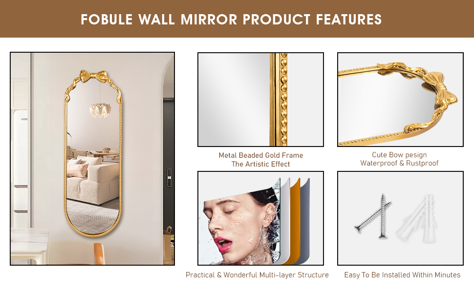 HD ومقاومة للانفجار - تعتمد مرآتنا الذهبية العتيقة الفنية الفاخرة على مرآة زجاجية فضية عالية الدقة مقاس 4 مم غير قابلة للتشويه لتوفير انعكاس واضح وتصميم عصري بسيط. بالإضافة إلى ذلك، يمكن للفيلم المقاوم للانفجار أن يحافظ على سلامة عائلتك بمجرد كسر مرآة الحائط.
