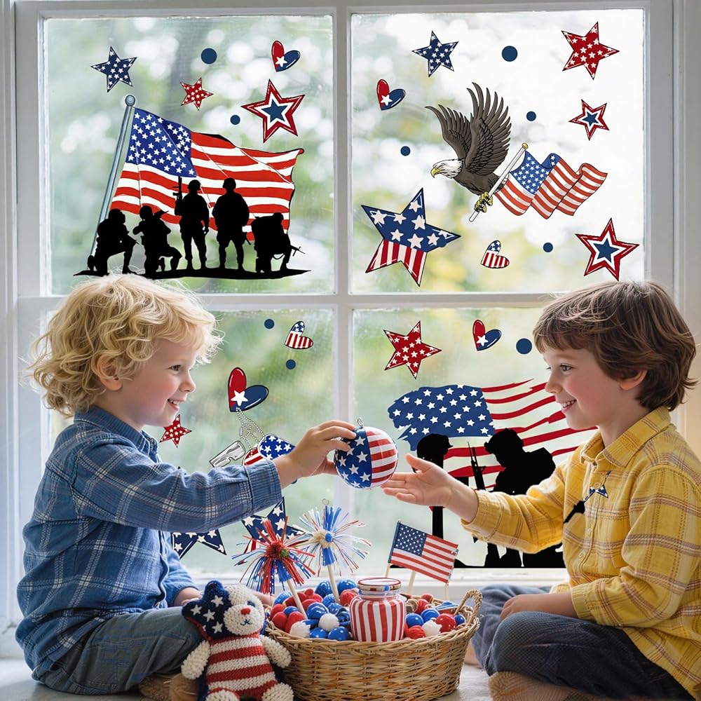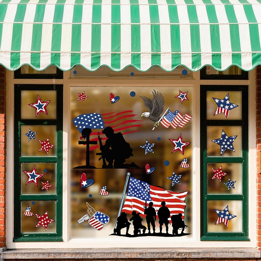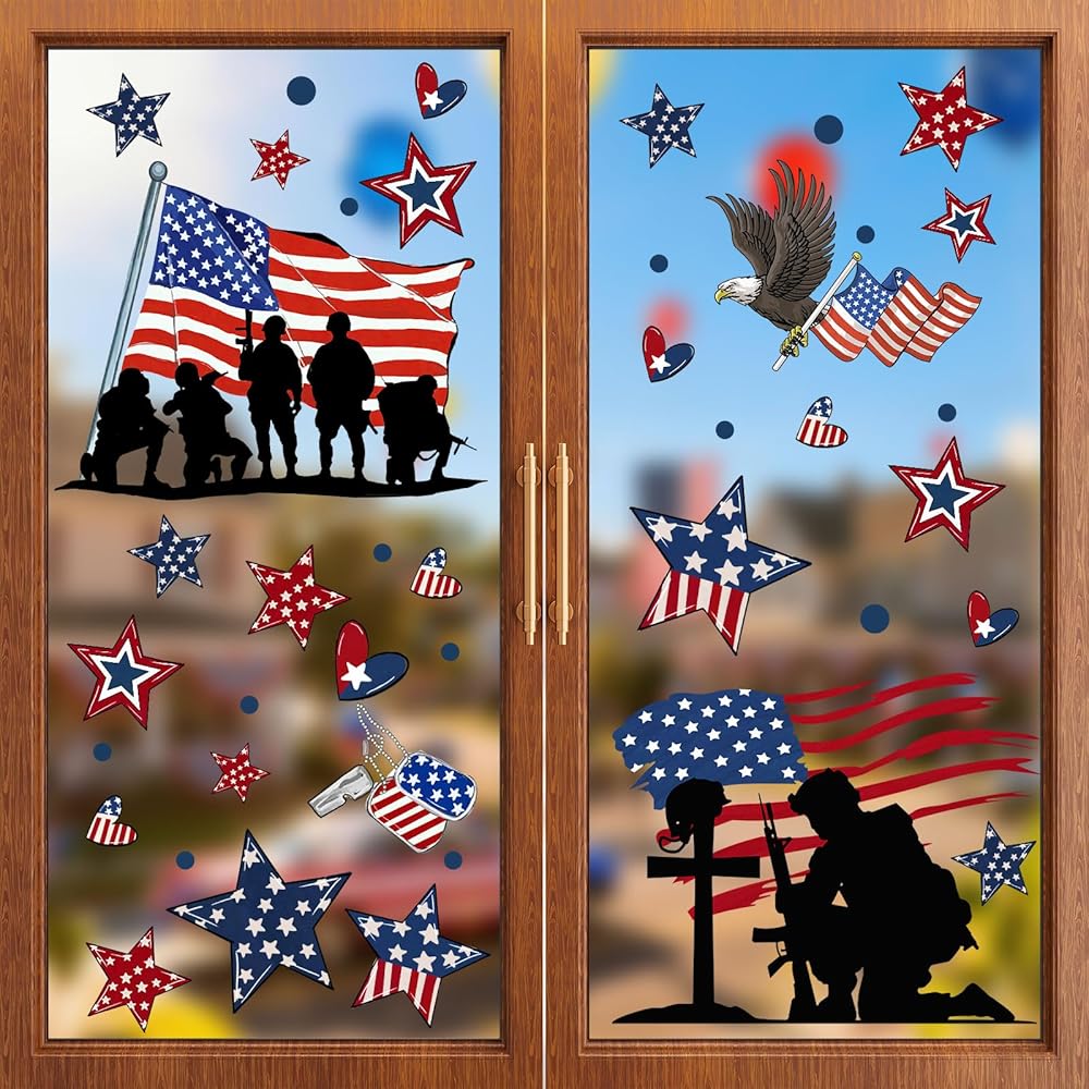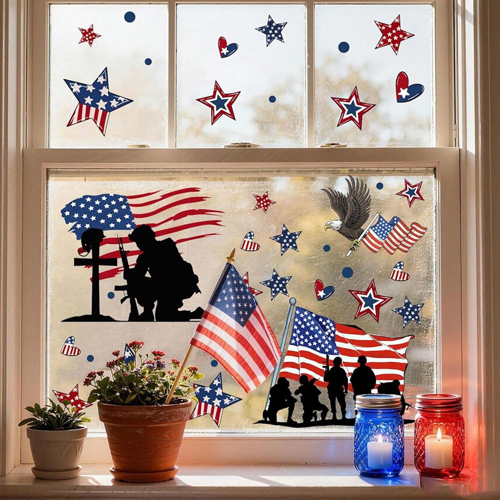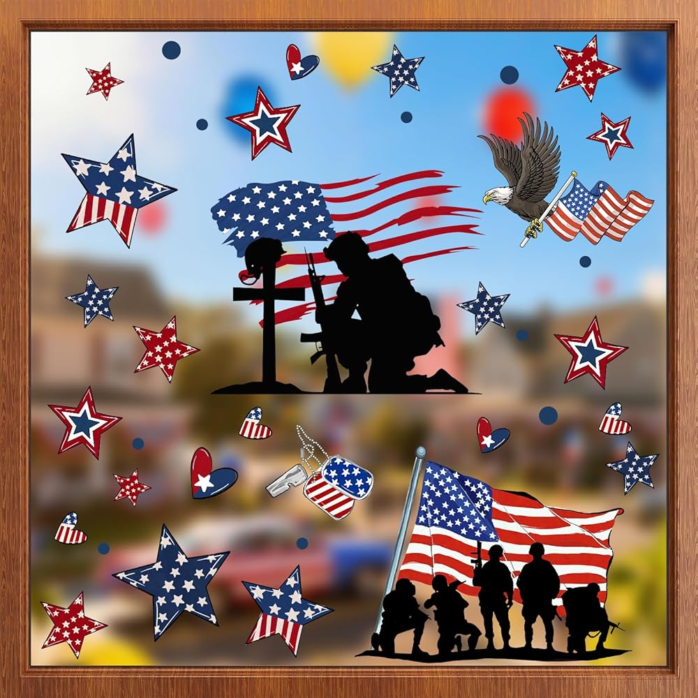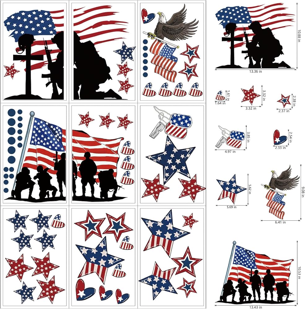ZAWE 9 أوراق جنود نجوم أمريكا الوطنية التذكارية اليوم التذكاري نافذة تلتصق على الوجهين قابلة لإعادة الاستخدام ملصقات نافذة ثابتة لتزيين الحفلات والفصول الدراسية والمكاتب