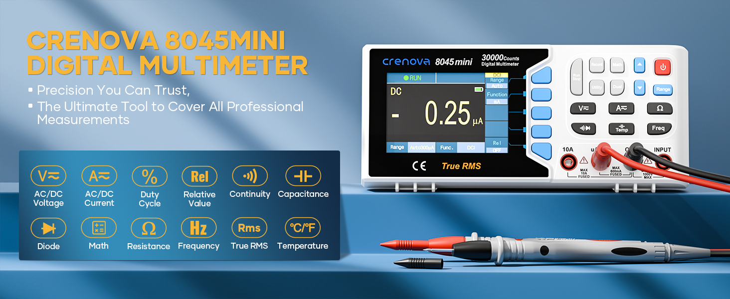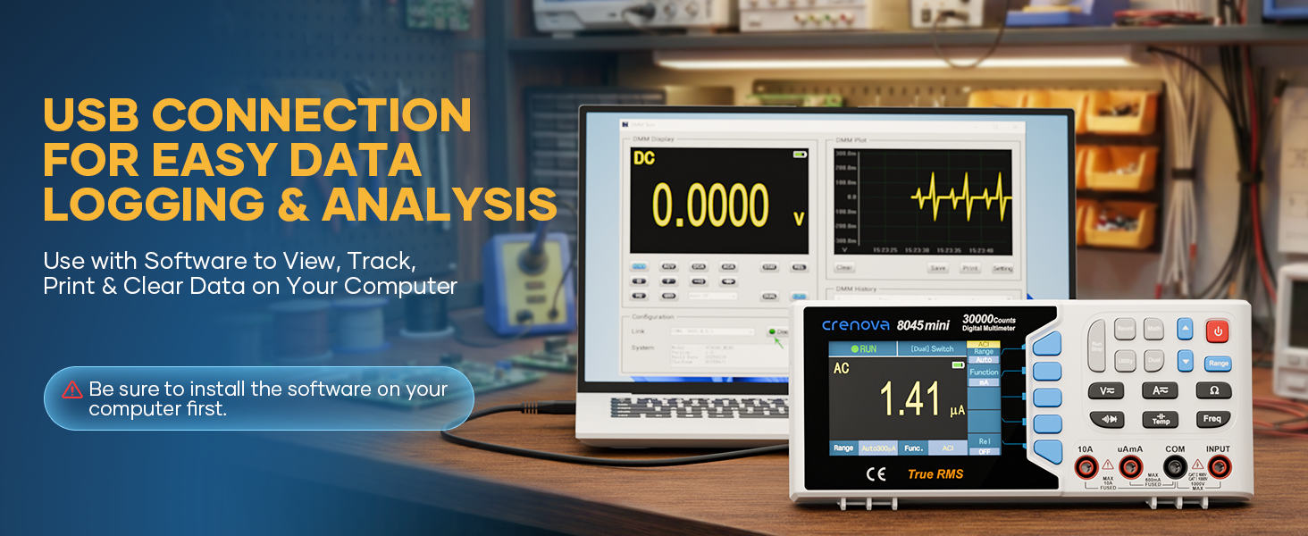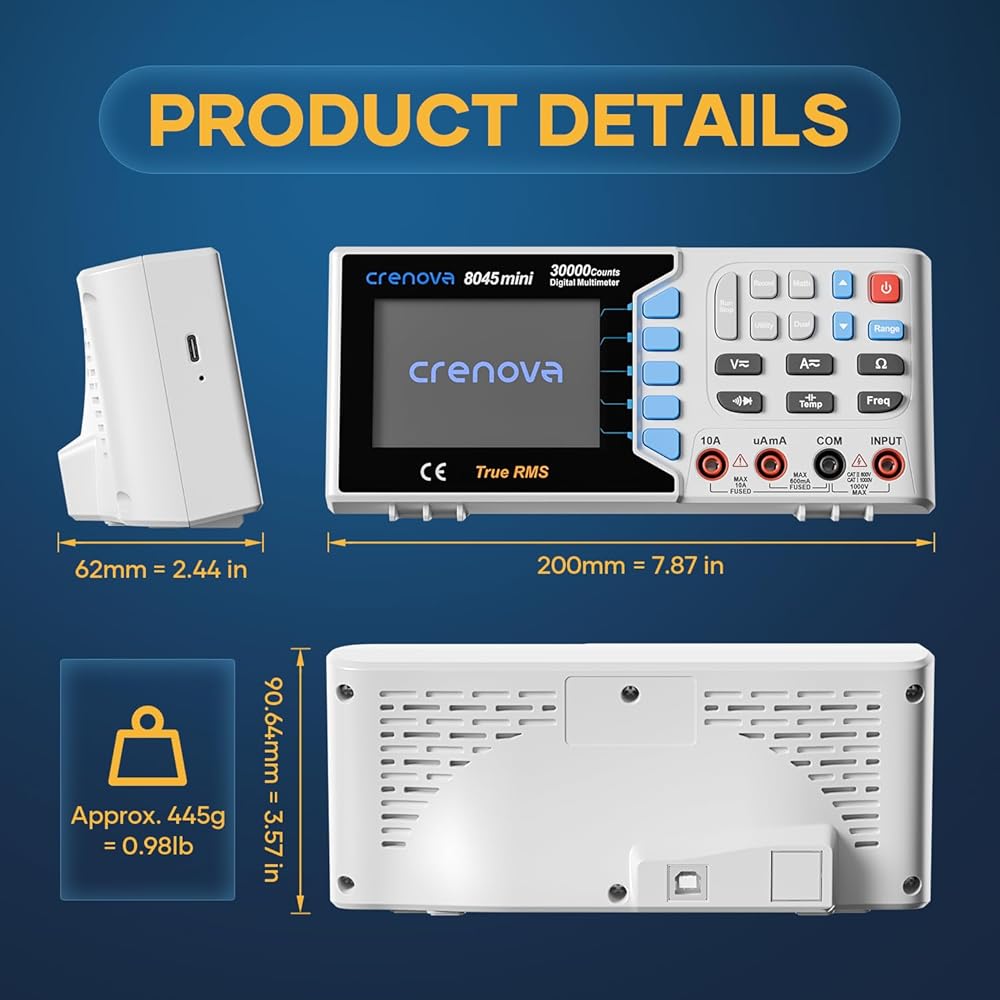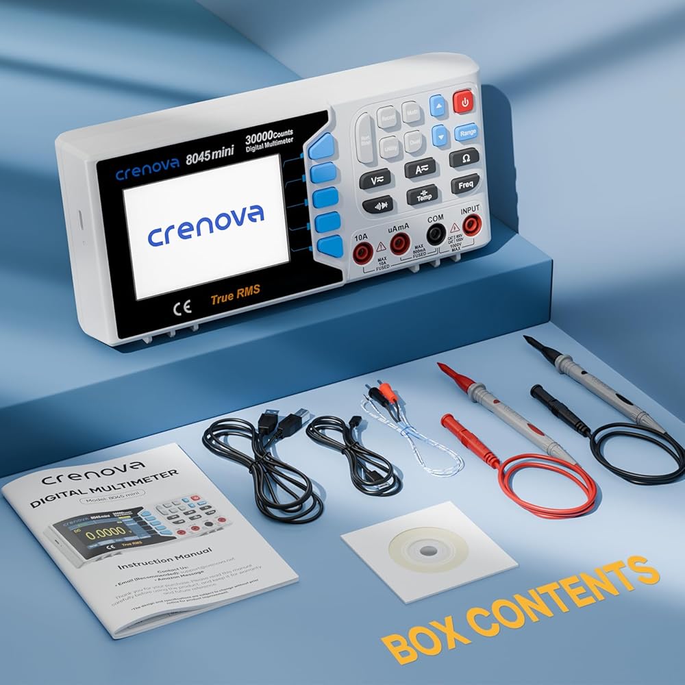 [مجموعة كاملة الكل في واحد، جاهزة للاستخدام]: تشتمل هذه المجموعة الكاملة الكل في واحد على مقياس متعدد رقمي صغير Crenova 8045 (1)، سلاسل اختبار المسبار (زوج واحد)، مسبار حراري من النوع K (1)، كابل USB A إلى USB B (1)، كابل شحن USB من النوع C (1)، قرص تثبيت البرنامج (1) ودليل المستخدم (1). كل ما تحتاجه للبدء في القياس بمجرد إخراجه من الصندوق.