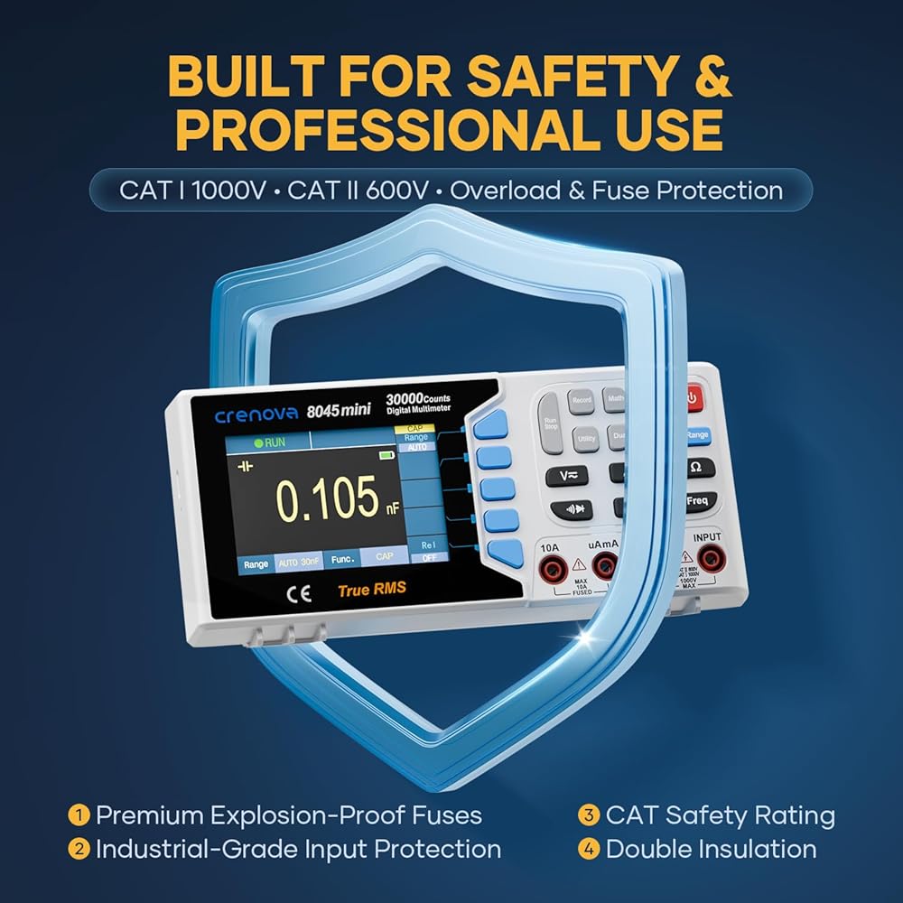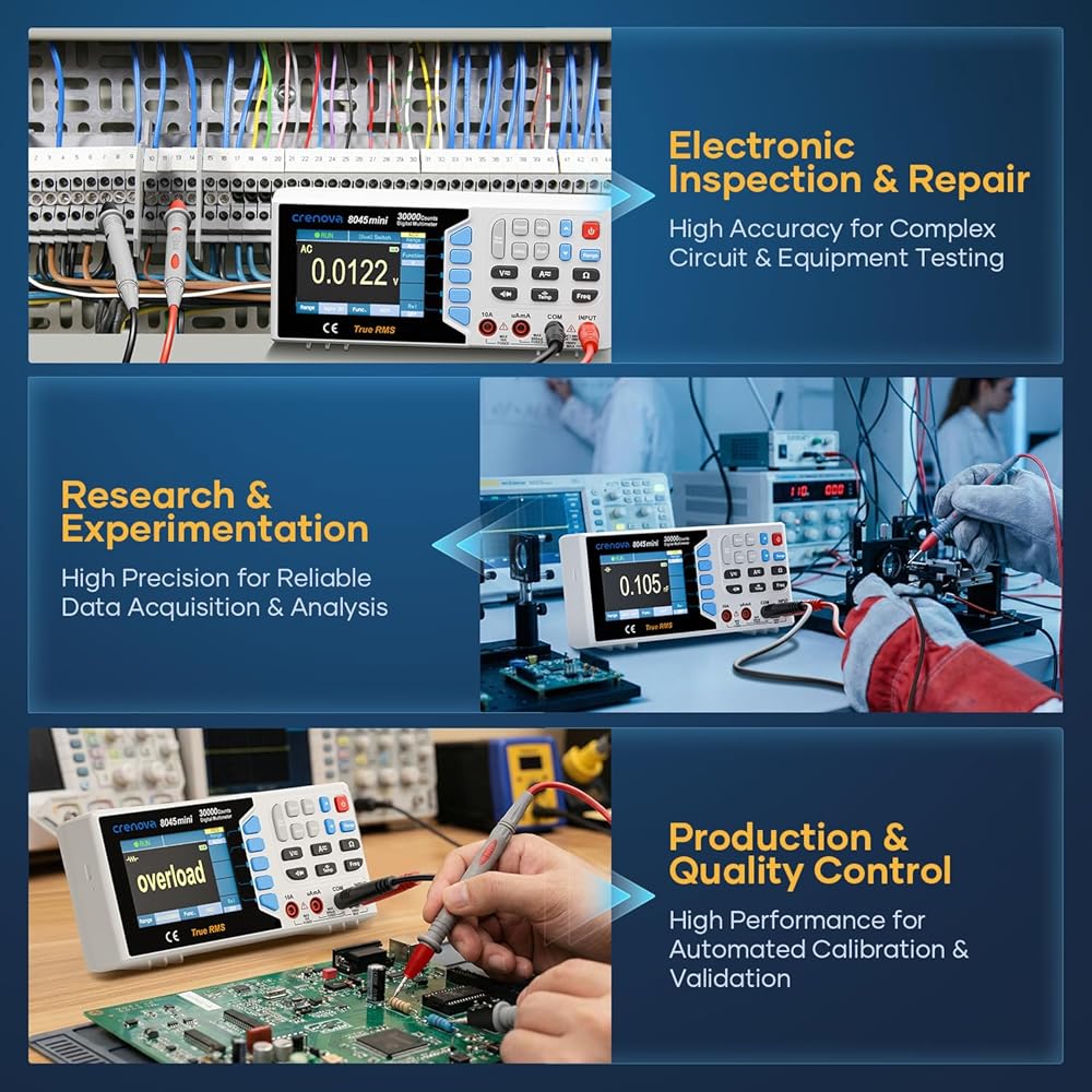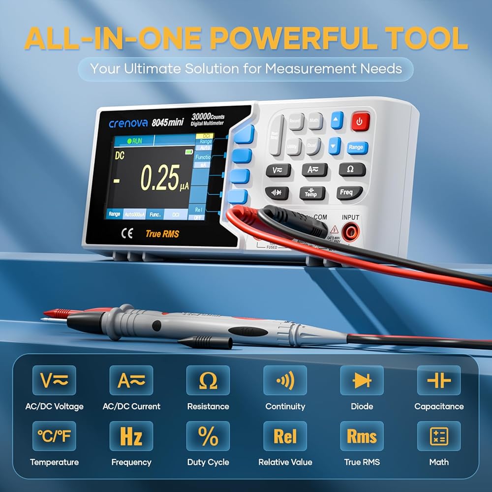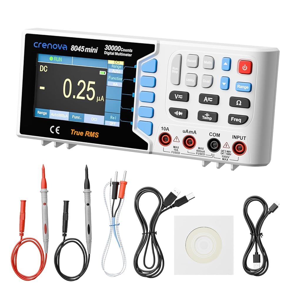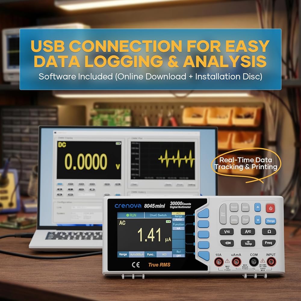 جهاز قياس متعدد رقمي True RMS من Crenova 30000، جهاز قياس متعدد على سطح المكتب للاستخدام في المختبر والصناعي. تسجيل بيانات USB، CAT II 600V. يقيس الجهد والتيار والمقاومة والسعة ودرجة الحرارة.
