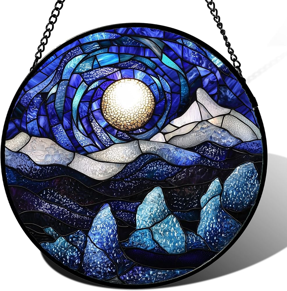 نافذة زجاجية ملونة معلقة، جبال زرقاء متدرجة، صائد شمس القمر لنافذة ديكور المنزل، مناظر طبيعية ثلجية، هدايا عيد ميلاد الأم للنساء والرجال والأم والنانا 9.8 بوصة in Kuwait