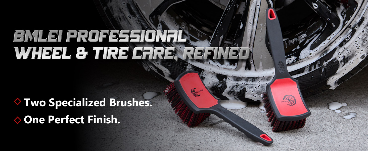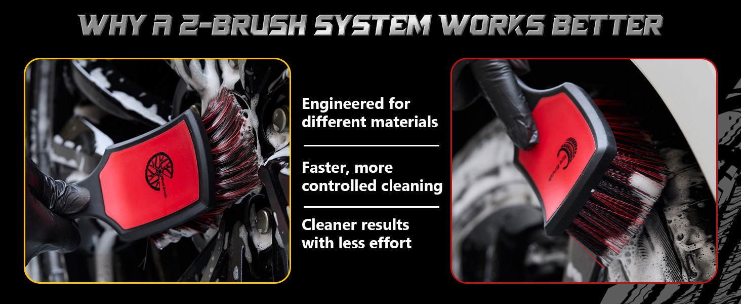 مجموعة تنظيف العجلات والإطارات 2 في 1 - تتضمن فرشاة واحدة لتنظيف الإطارات الصلبة لتنظيف الإطارات بعمق وفرشاة حافة عجلة ذات شعيرات ناعمة لحواف خالية من الخدوش. الفرشاة المناسبة لكل وظيفة، لا داعي للشراء بشكل منفصل.