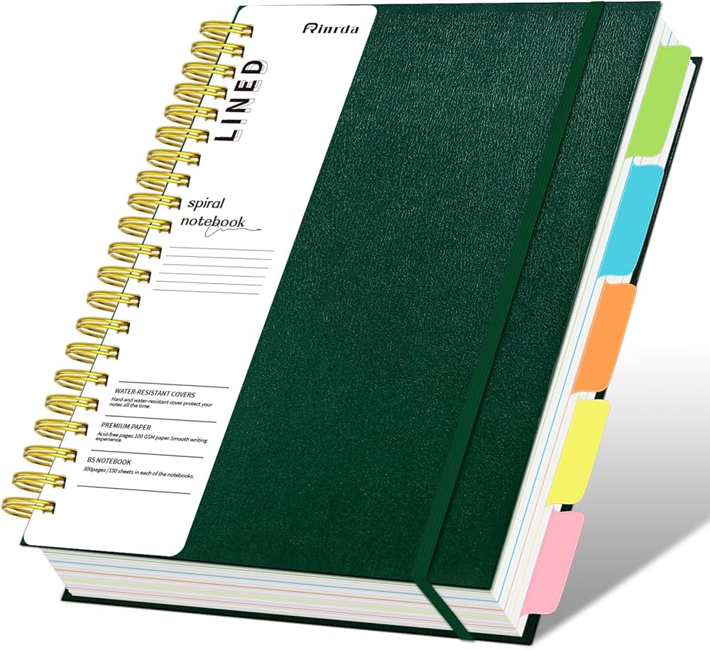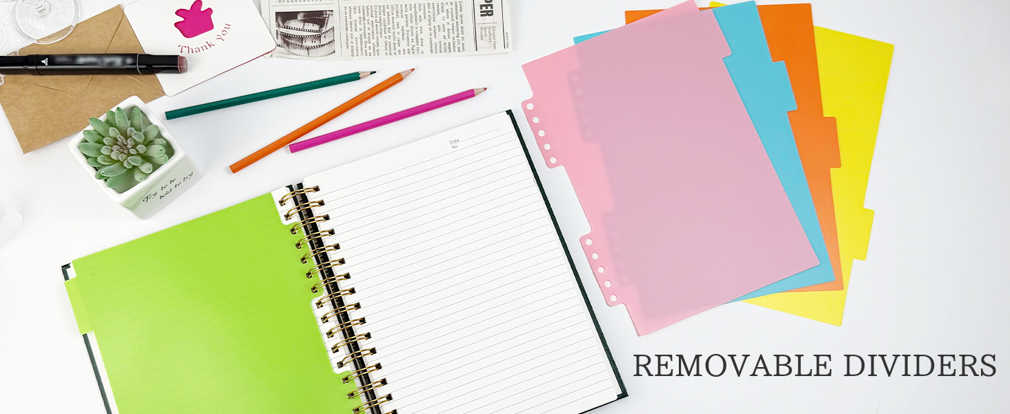 دفتر ملاحظات ذو 5 موضوعات مع فواصل وعلامات تبويب: دفتر ملاحظات حلزوني مبطن بغلاف مقوى بقياسات 7.5 × 10 بوصة. يأتي مع شريط إغلاق مرن و5 فواصل قابلة للإزالة.