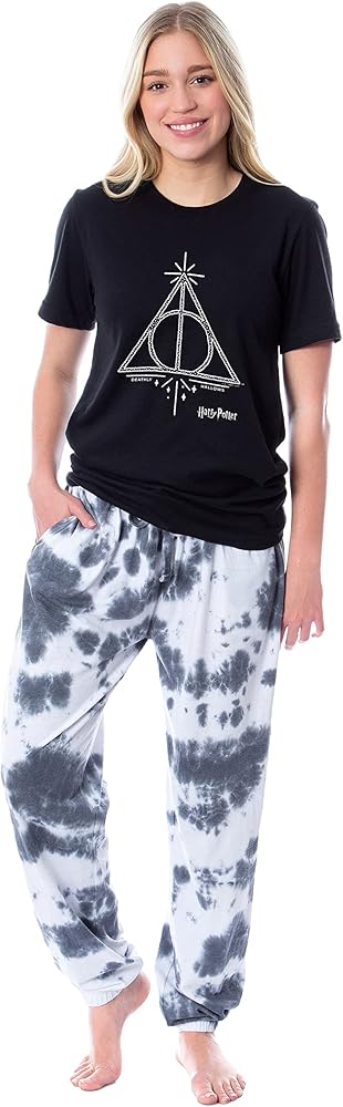 موضوع مفصل - تتميز مجموعة البيجامة هذه برمز "Deathly Hallows" من هاري بوتر وعالم السحرة. سراويل بيجامة الركض هي صبغة ربطة عنق ممتعة! إنه من أجل الاستمتاع بجميع وسائط هاري بوتر المفضلة لديك والاستمتاع بها!