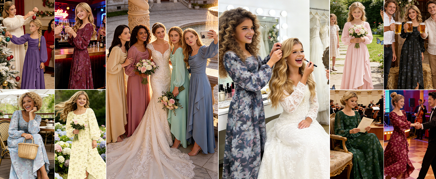 مناسبات فساتين الربيع والصيف الزهرية: مثالي لحفلات الزفاف، والمهرجانات، وحفل بلوغ الخامسة عشرة، والمناولة الأولى، والحلويات 15 16، وأعياد الميلاد، والكريسماس، والعطلات، وحفلات استقبال المولود الجديد، وحفلات العودة للوطن، وحفلات الزفاف، وحفلات العزوبية، والمعمودية، وعيد الفصح، والخطوبة، وعيد الأب، والهالوين، وعيد الأم، ورأس السنة الجديدة، وعيد القديس باتريك. فساتين عيد القديس باتريك، أو عيد الشكر أو المناسبات الخاصة الأخرى