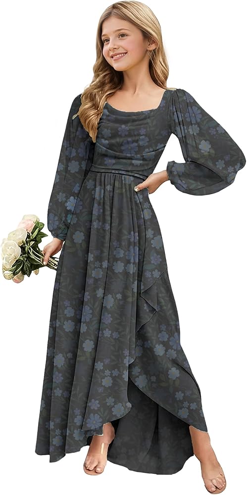 تصميم فساتين الأزهار: فستان طويل برقبة مربعة، فستان فتاة الزهور مرتفع ومنخفض، كم طويل منتفخ مع فتحة جانبية عالية، اختيار نابض بالحياة وأنيق لوصيفات العروس الصغيرة، أو ضيوف الزفاف، أو الحاضرين في الحفلات الراقصة، حاشية مكشكشة غير متماثلة تضيف حركة ديناميكية وذوق رومانسي إلى الفستان. سوف تكون أميرتك الصغيرة متحمسة لهذا الفستان الطويل للفتيات