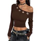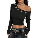 • Features: Grommet eyelet decor, long sleeve, asymmetrical neck, slim fit, solid color, grunge style, crop t shirts for women