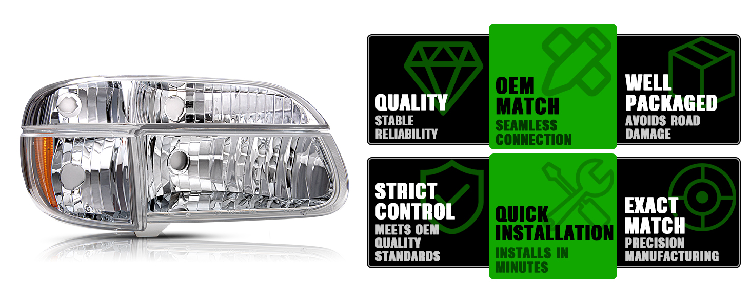 【معتمدة من DOT & SAE】تلبي المصابيح الأمامية من نوع الهالوجين عالية الجودة للسائق والراكب جميع متطلبات السلامة المعتمدة من DOT وSAE. يتميز الغلاف المطور بأنه مقاوم للصدمات والحرارة، مما يضمن متانة أفضل مقارنة بالمصابيح الأمامية الأخرى. تتمتع العدسات المتفوقة بنقل جيد للضوء وصلابة عالية ومقاومة ممتازة للأشعة فوق البنفسجية لمنع الاصفرار والتشقق