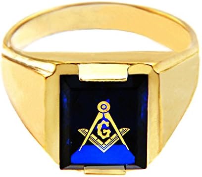 fraternal mason statement ring designed with a rectangular blue stone inscribed with the universal letter g with square and compass symbol of the masonry movement