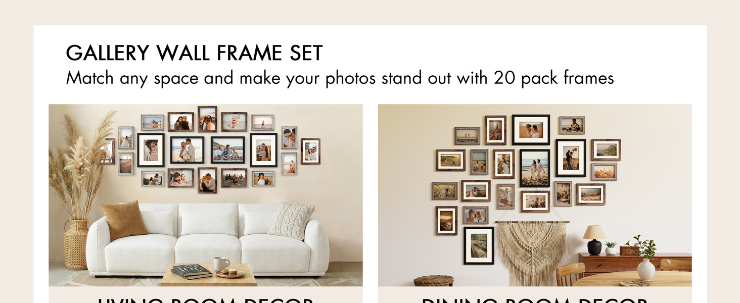 • استخدام متعدد الوظائف: بالإضافة إلى استخدام مجموعة إطارات الصور المكونة من 20 قطعة كعرض للحائط، يمكنك أيضًا وضع إطارات الصور لتزيين الحائط بشكل فردي على سطح المكتب أو رف الكتب لتزيين منزلك أو مكتبك، مما يضيف إحساسًا بالدفء إلى المساحة