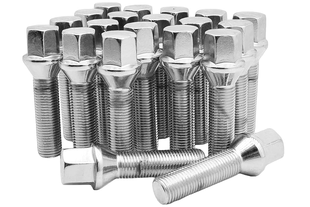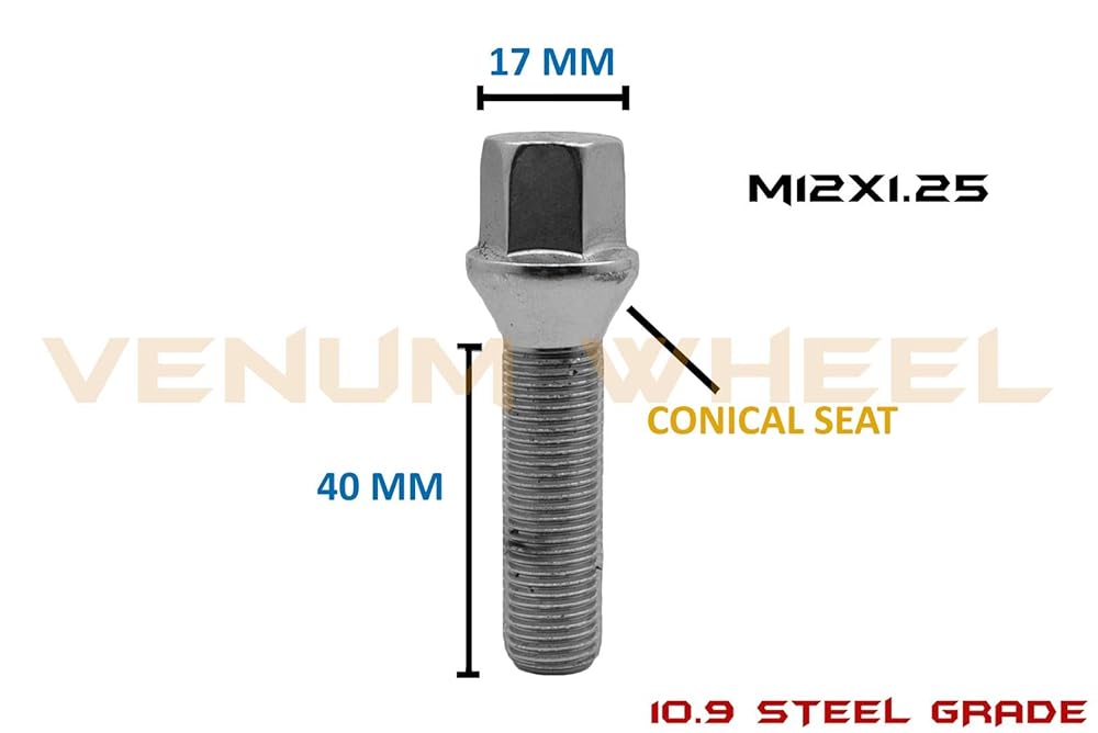 • Lug Bolt Specs: 17 MM Hex | Qty: 20 | Seat Type: Conical (Cone) | Thread Pitch: M12x1.25 | Shank Length: 40 MM | Finish: Chrome | Grade 10.9 Steel | Corrosion/Rust Resistant