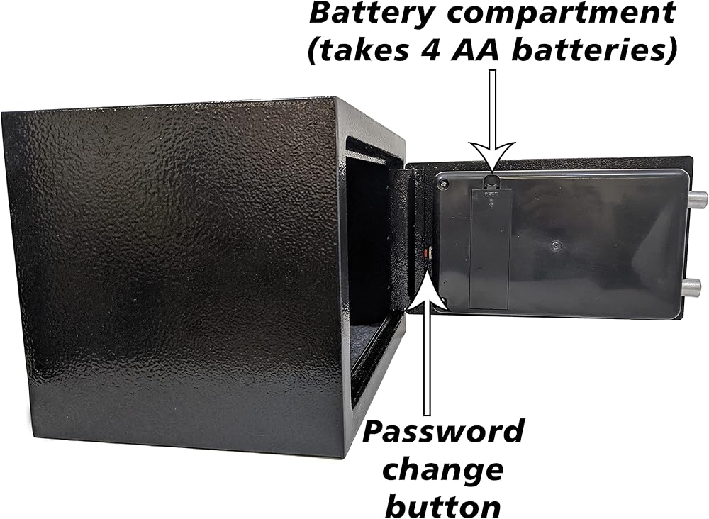 • مدعوم من بطاريات AA 4x. إذا كانت البطاريات منخفضة، يظهر ضوء تحذير. إذا استنفدت البطاريات بالكامل، يمكن استخدام مفاتيح الطوارئ لفتح الخزنة واستبدال البطاريات.