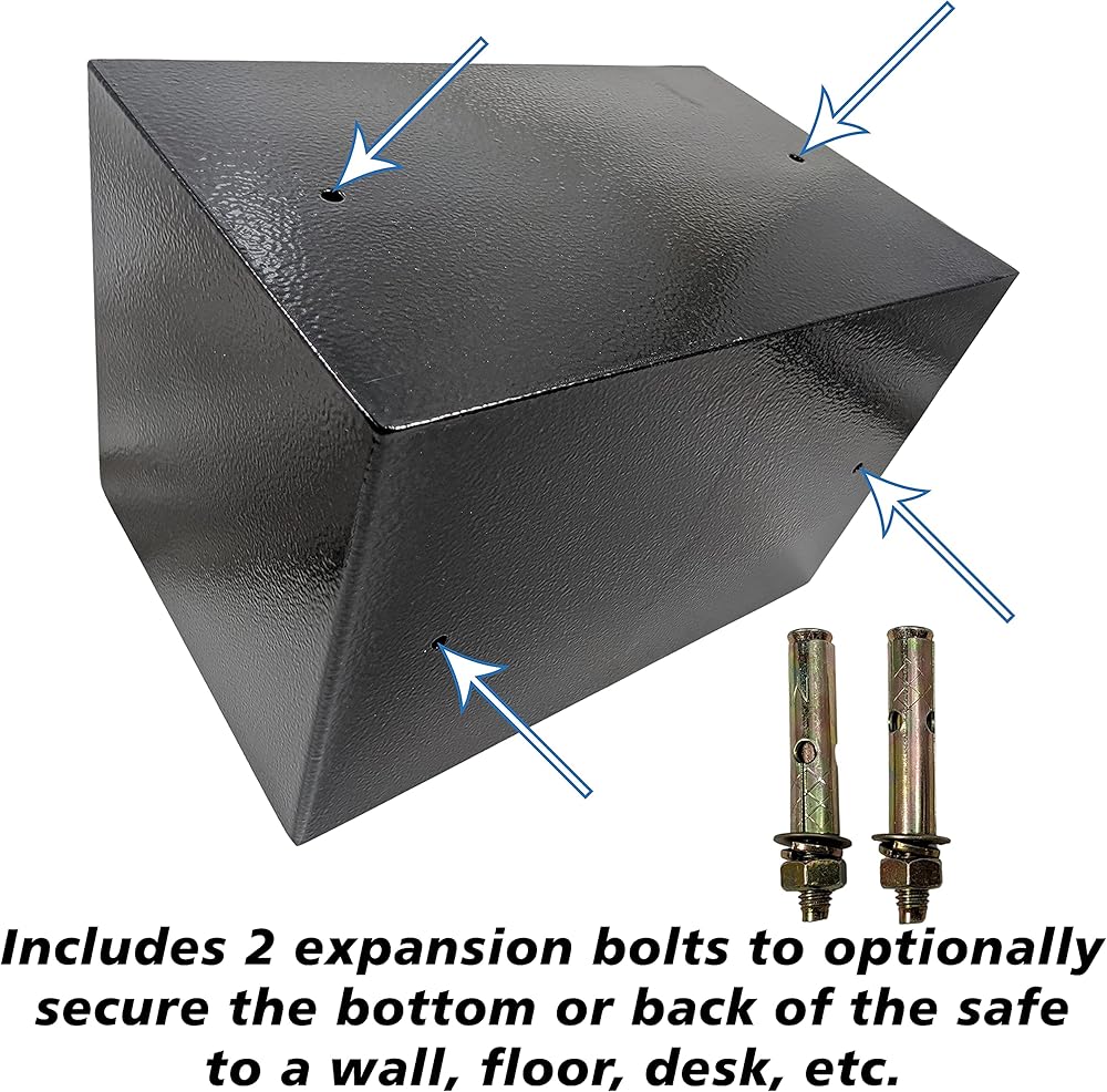 • يتضمن 2 مسمار توسيع يناسب الفتحات المثقوبة مسبقًا في الجزء الخلفي والسفلي من الخزنة لتأمين الخزنة بشكل اختياري على الحائط أو الأرضية أو الرف أو المكتب أو أي سطح مستوٍ آخر.