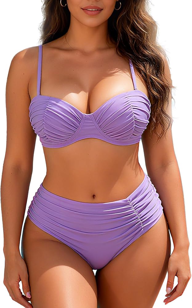 Elevate your poolside confidence with our stunning High Waisted Underwire Bikini Set in elegant lavender purple. This two-piece swimsuit perfectly combines fashion-forward design with functional features that flatter every body type.The underwire push-up top features structured cups with beautiful ruched detailing that provides exceptional lift and support while creating a naturally enhanced silhouette. The adjustable shoulder straps ensure a customized, secure fit, while the bandeau-style design offers timeless elegance.The high-waisted bottom is the star of this set, sitting comfortably above your navel to provide superior tummy control and a smoothing effect. Strategic ruching along the sides not only adds visual interest but also helps contour your waistline for a slimming appearance. With full coverage design, you can move freely and confidently without worrying about adjustments.Perfect for beach vacations, pool parties, resort getaways, or simply lounging by the water, this swimsuit offers the ideal balance of coverage, support, and style. The premium-quality fabric is soft against your skin, quick-drying, and resistant to chlorine and fading, ensuring your swimsuit looks beautiful season after season.Available in multiple sizes to accommodate various body types. Whether you're swimming laps, playing beach volleyball, or simply soaking up the sun, this high-waisted bikini set will become your go-to swimwear choice for comfort and confidence.