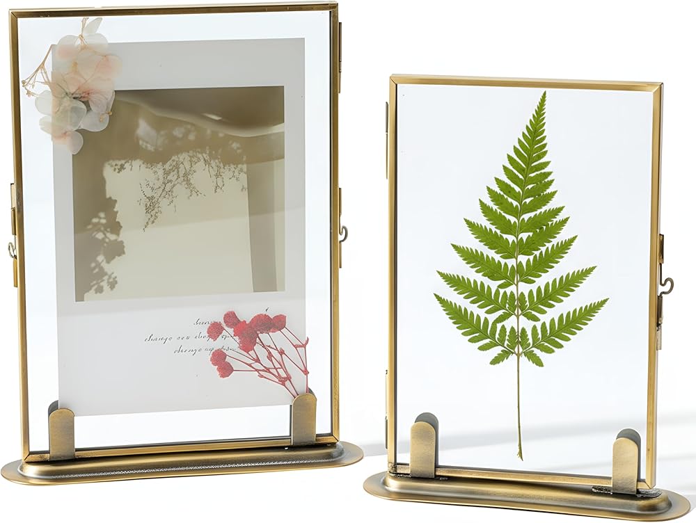 2 حزمة من الإطارات النحاسية العائمة العتيقة الذهبية لإطارات الطاولة للصور 5 × 7 و4 × 6، زجاج مزدوج مضغوط على شكل زهرة ديكور لمكتب الزفاف المنزلي