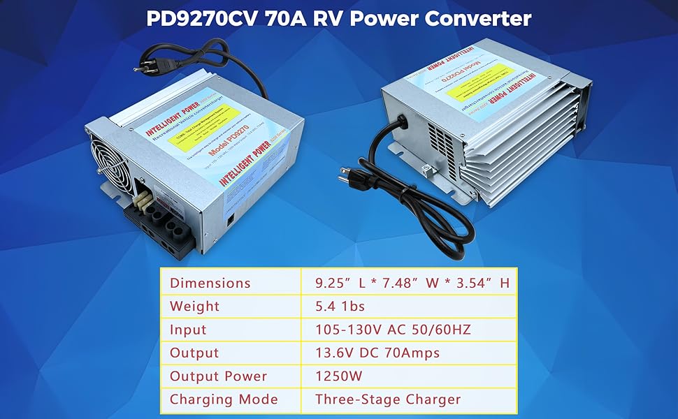 • 【محول وشاحن عالي الأداء】 يوفر PD9270 خرج 70 أمبير وطاقة مستمرة 1250 وات، ويحول 105-130 فولت تيار متردد إلى 13.6 فولت تيار مستمر (±3 فولت تيار مستمر) لإمداد طاقة RV موثوق به