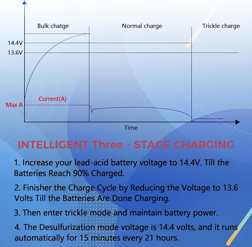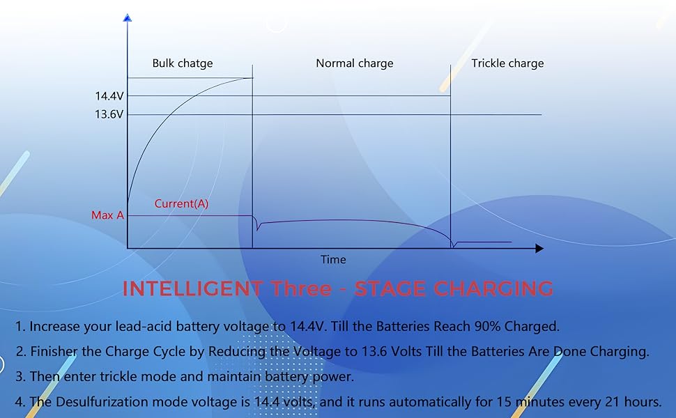 • 【شحن ذكي ثلاثي المراحل 】 الشحن التلقائي/العادي/التخزين يحافظ على صحة البطارية. الشحن بالجملة عند 14.4 فولت للشحن السريع، والشحن العادي عند 13.6 فولت، والشحن العائم يمنع الشحن الزائد