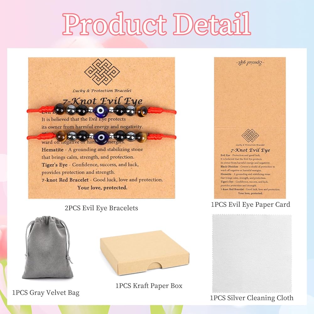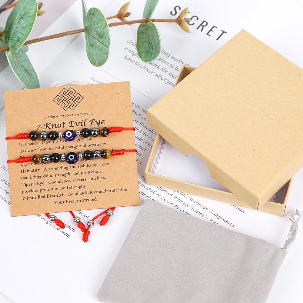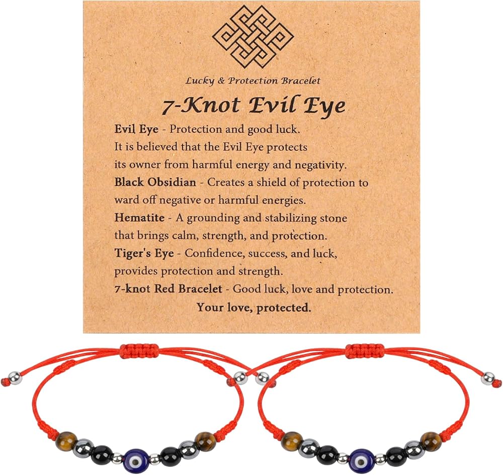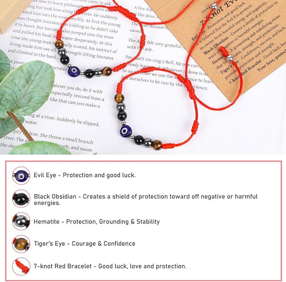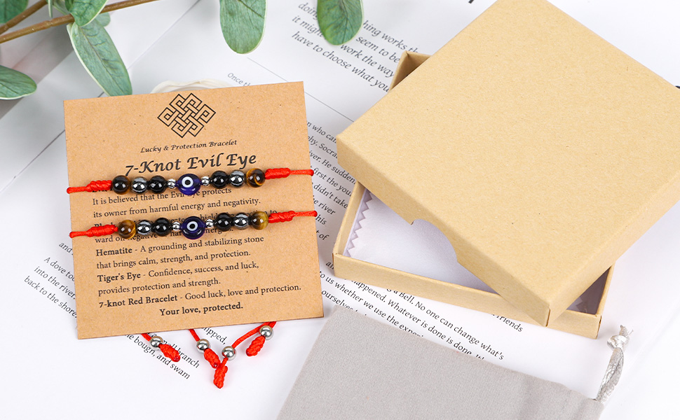 المادة والمعنى: العين الشريرة والحبل الأحمر يحجبان الطاقة السلبية ويجذبان الحظ الجيد. يوفر حجر السج الأسود الحماية والقوة، ويوفر الهيماتيت الشفاء والصحة، وتجسد عين النمر الشجاعة والثقة - عند ارتدائها معًا، فإنها تشكل درعًا قويًا من الحب والحظ والحماية.