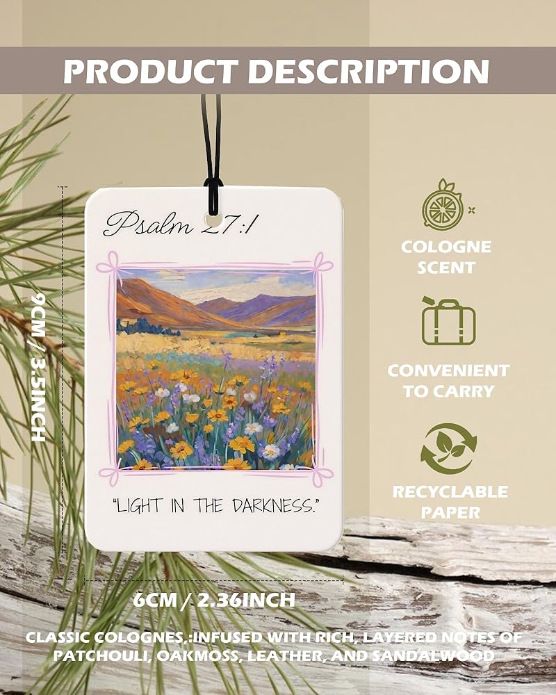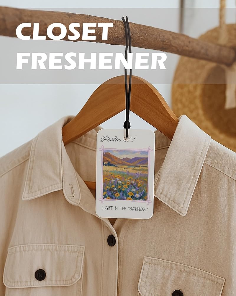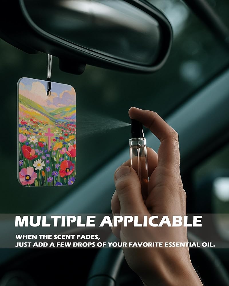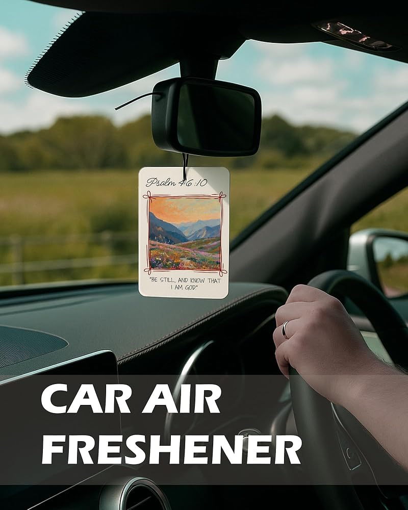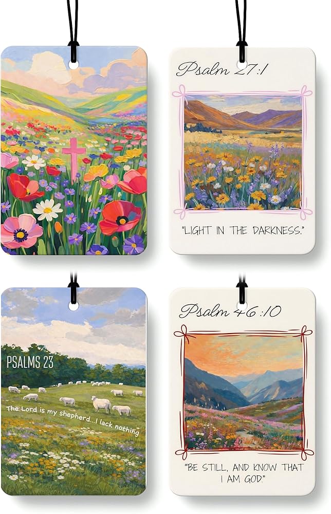 Bring faith and color into your everyday spaces with EKGJW Christian Floral Citrus Air Fresheners. This 4-piece set features vibrant floral landscapes paired with powerful scripture verses. Inspired by peaceful countryside scenes and blooming wildflowers, each design reflects hope, strength, and quiet trust in God. The fresh citrus fragrance provides a clean orange-lemon scent that refreshes your car and small spaces without being overwhelming. A meaningful combination of decorative art and uplifting faith — perfect for women and men who appreciate scripture-inspired decor.